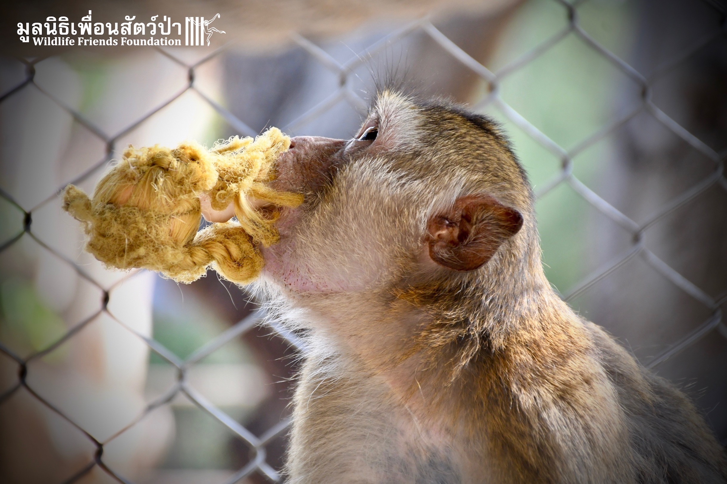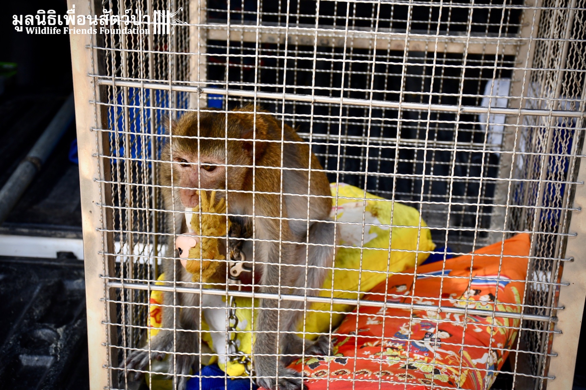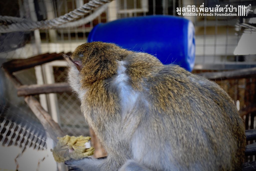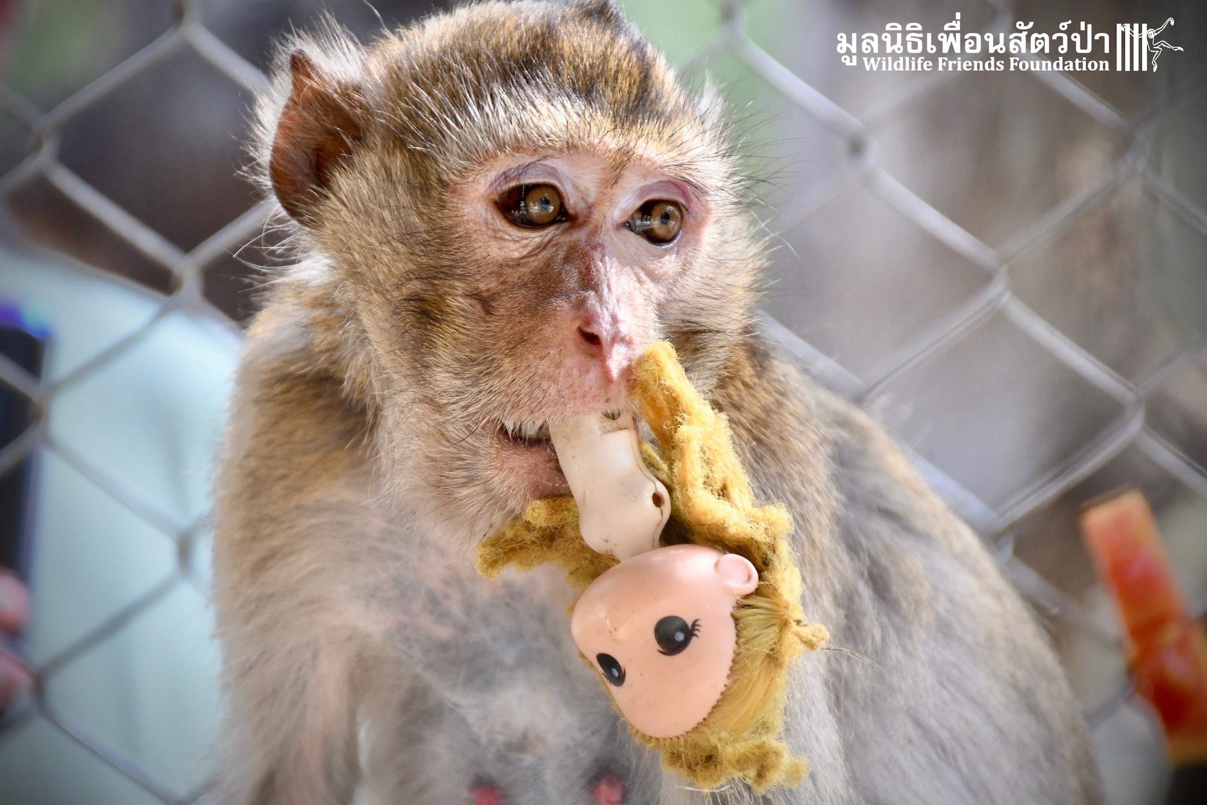 Maruay has been with us for 2 weeks now, she is undergoing a quarantine period at the WFFT Wildlife Hospital along with her two dolls. These dolls have been her only source of comfort over the years and she is very upset if separated from them. Imagine having no other friends, no other monkeys to socialize with, and some plastic dolls as a replacement. Luckily here at WFFT we have some other elderly monkeys which we hope to introduce her to in the not to distant future.