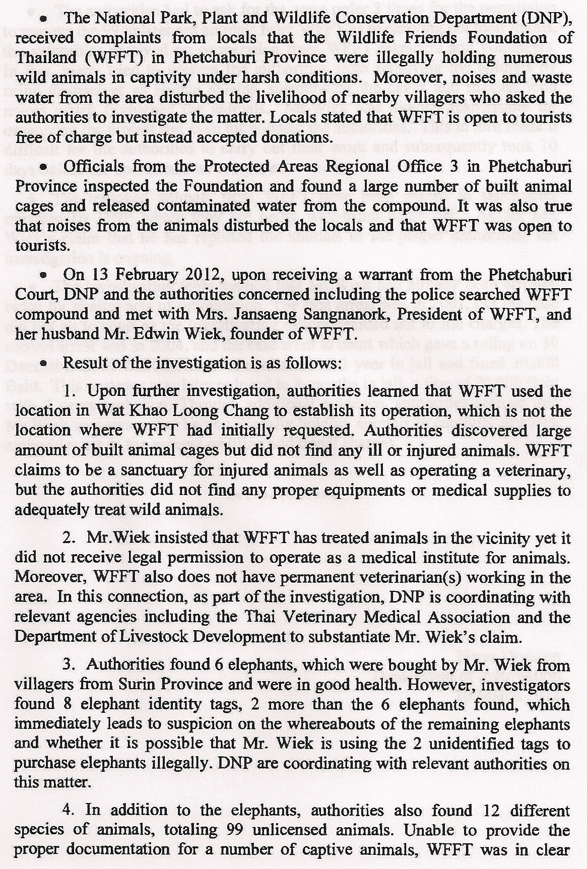 3. Mr Wiek did not buy any elephants. The WFFT has taken in elephants for treatment over the last few years and in some cases generous sponsors have provided funds to effectively retire these elephants from working in the begging or tourist industry. All elephant rescued have been taken in legally and are absolutely captive elephants. The copies of 2 registration papers of 2 deceased elephants were shown to the authorities as their corpses have been buried on site. The ministry of interior has been informed about the death of these elephants as required by law. Actually both of the elephants were not our property, so the actual person(s) that needed to report the deaths is not we. The DNP should know their laws before accusing us of illegal elephant trade.