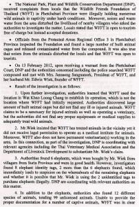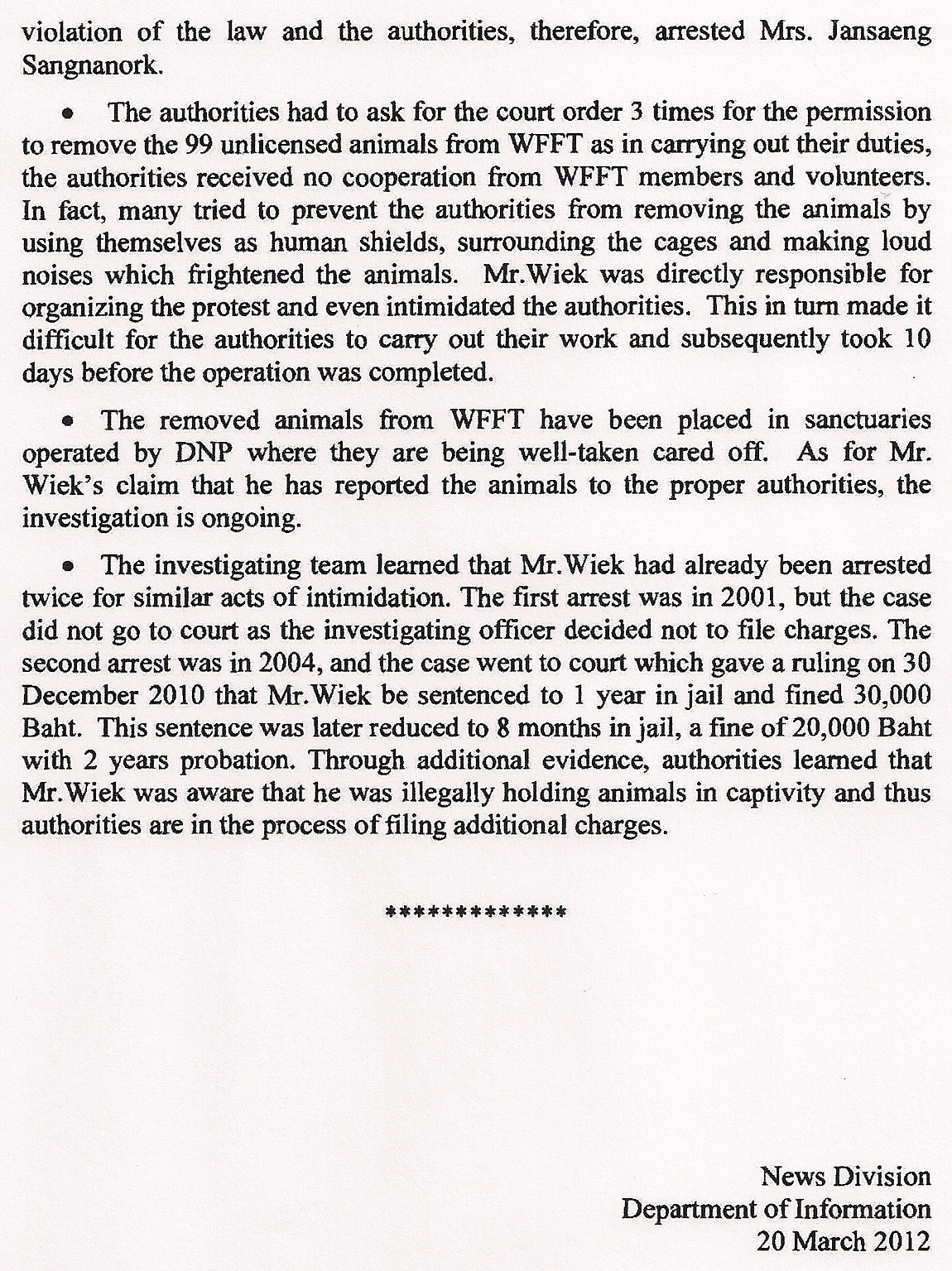 2. WFFT has had (Thai) veterinarians working on site for the last couple of years, and evidence in the form of pictures and written treatment sheets have been shown to the DNP officials. We are currently engaged in clearing this matter with the relevant authorities, not the DNP, as it is not their responsibility.