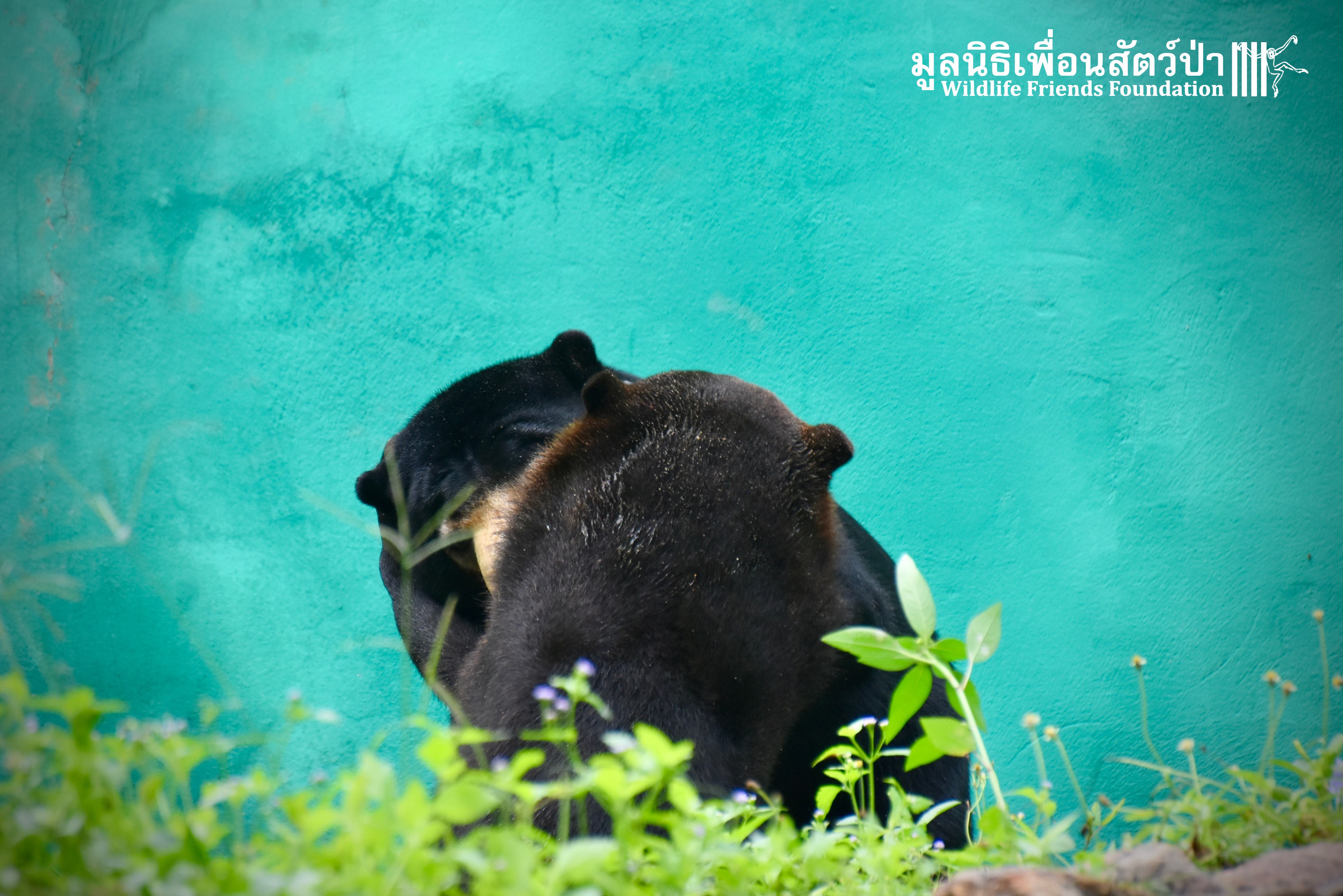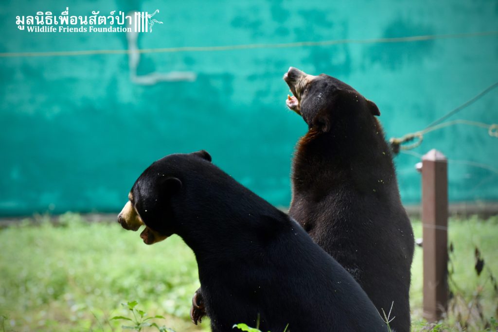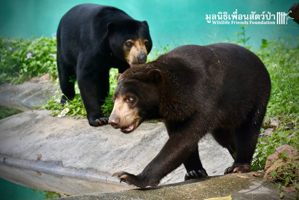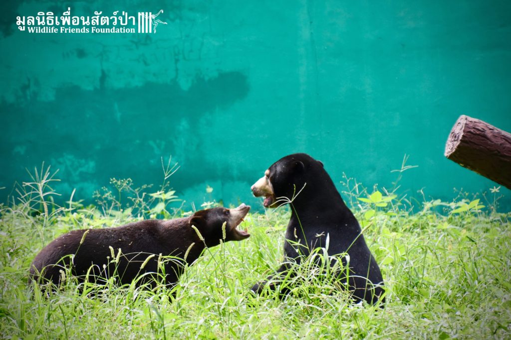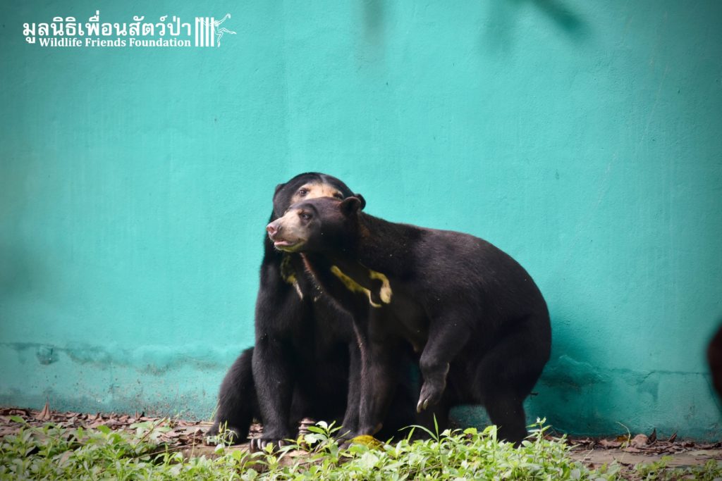 Back in 2008, some villagers poached a male Malayan sun bear (Helarctos malayanus) cub from a forest area near Laos, with the intention of selling him as a pet. They could not find a buyer quick enough, so they dumped him at Wat Klong Sai Nung , a temple near Thayang, when they were afraid of being caught by the police. At the temple, the monks hand-reared Kaka and kept him in an enclosure with a group of dogs. When he was rescued by WFFT he was 30kg, at just over one years of age. He was barking like a dog whilst in quarantine, but then calmed down when he was introduced to Gallamair, a 2-year-old female sun bear. Kaka became instant friends.