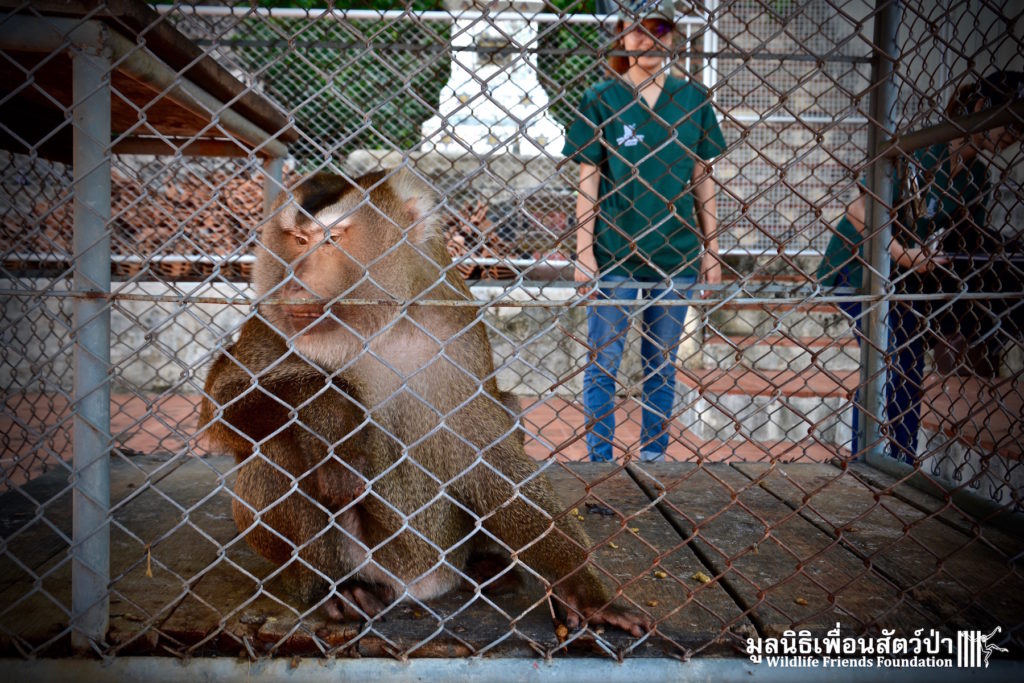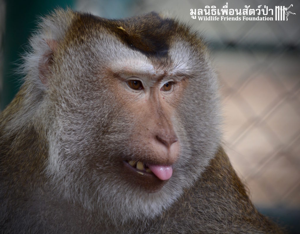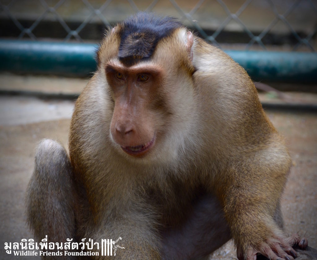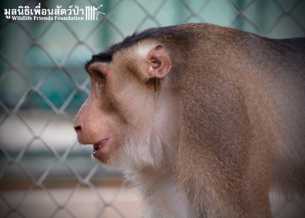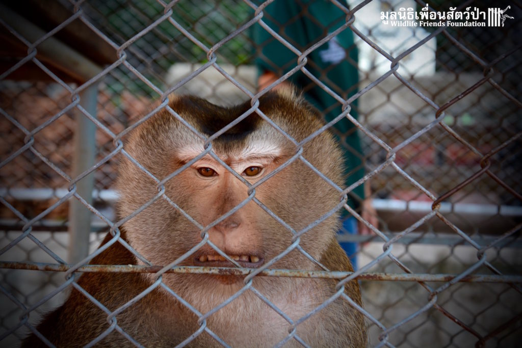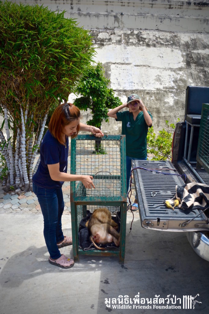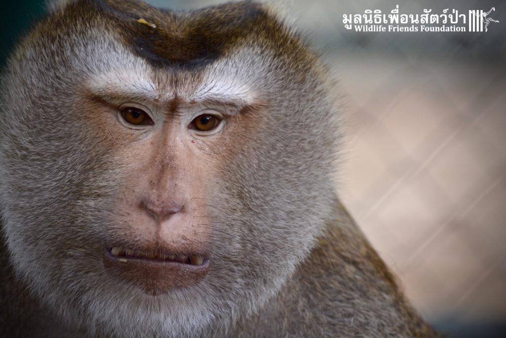Two days ago we received a call from staff at a temple in Phetchaburi regarding two unwanted male macaque residents they could no longer care for, during the initial conversation we were informed that the macaques were both around two years old, and easy to handle. The WFFT Rescue Team headed out to investigate. Upon arrival this was not the case, the macaques in question are both strong and aggressive adult male pig-tailed macaques. ‘See Nguen’ (Silver) is an eight-year-old Southern pig-tailed macaque (Macaca nemestrina) and ‘Gold’ (See Thong) is a four-year-old Northern pig-tailed (Macaca leonina).