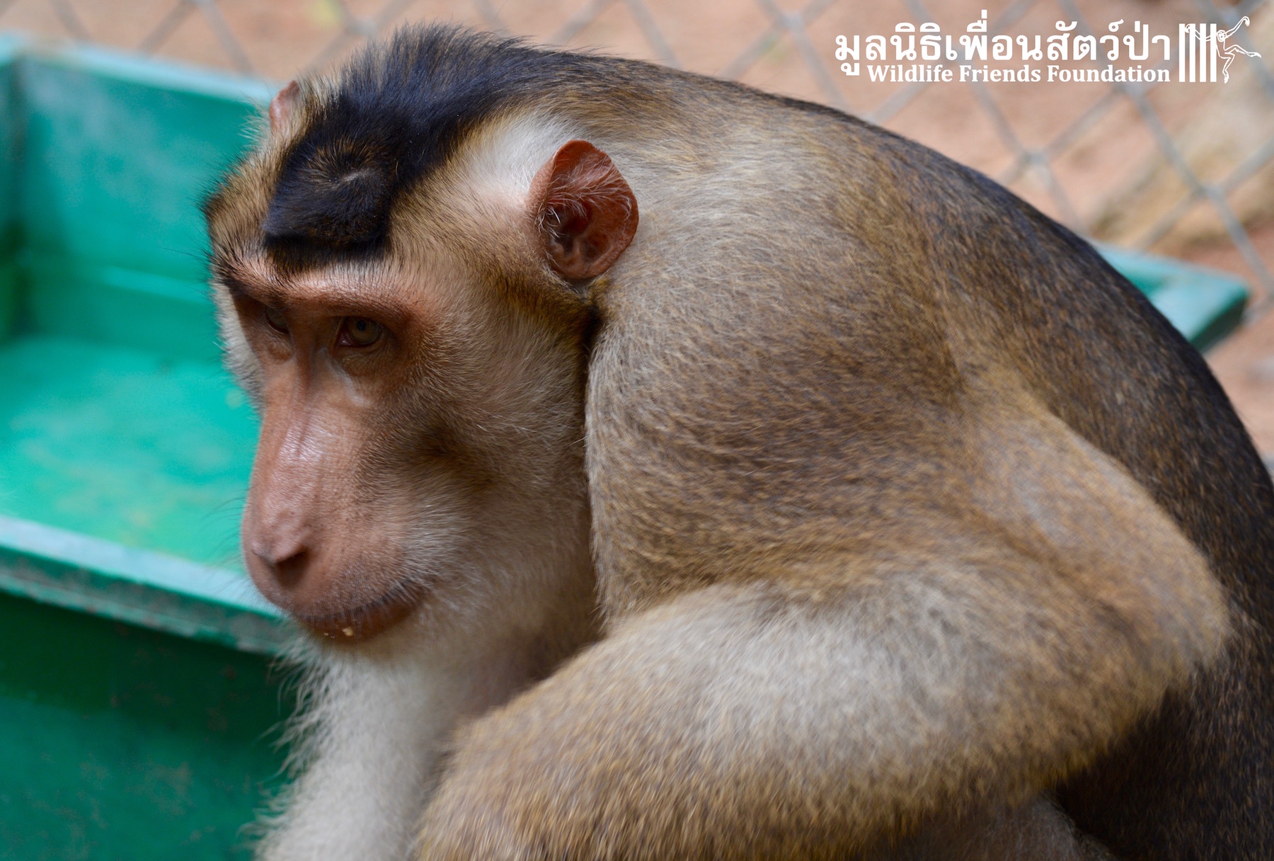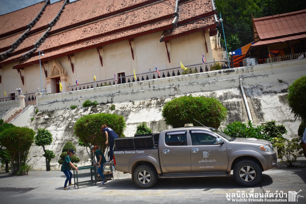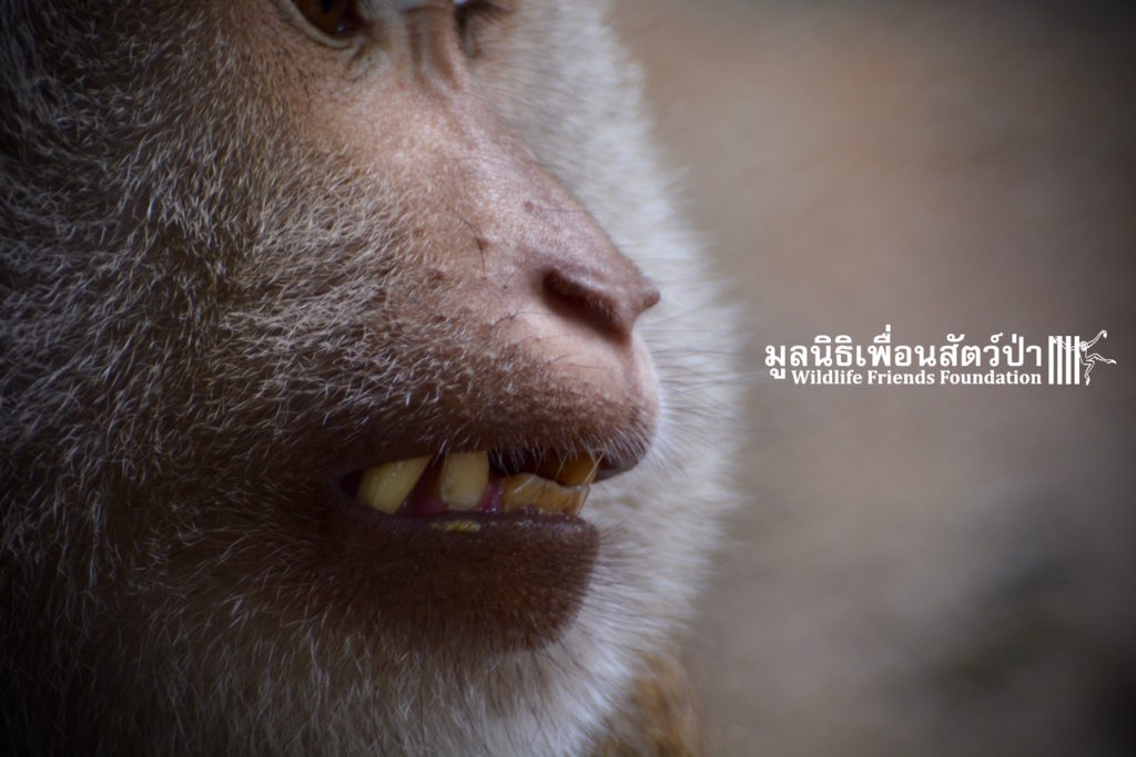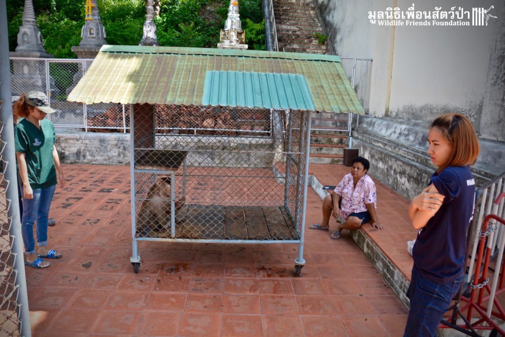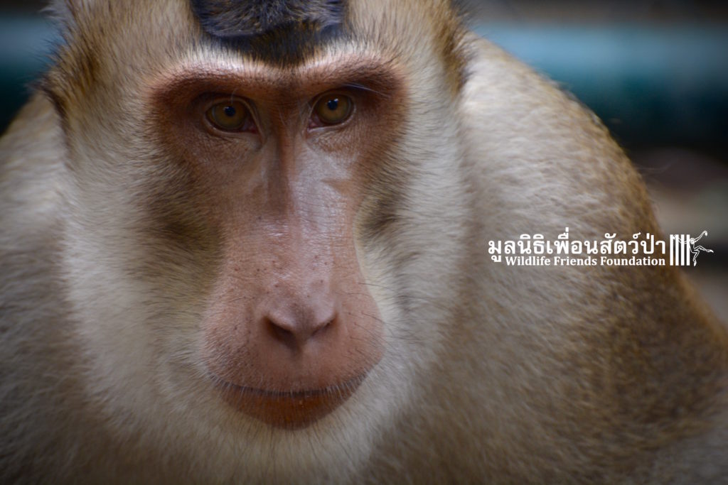 Two days ago we received a call from staff at a temple in Phetchaburi regarding two unwanted male macaque residents they could no longer care for, during the initial conversation we were informed that the macaques were both around two years old, and easy to handle. The WFFT Rescue Team headed out to investigate. Upon arrival this was not the case, the macaques in question are both strong and aggressive adult male pig-tailed macaques. ‘See Nguen’ (Silver) is an eight-year-old Southern pig-tailed macaque (Macaca nemestrina) and ‘Gold’ (See Thong) is a four-year-old Northern pig-tailed (Macaca leonina).