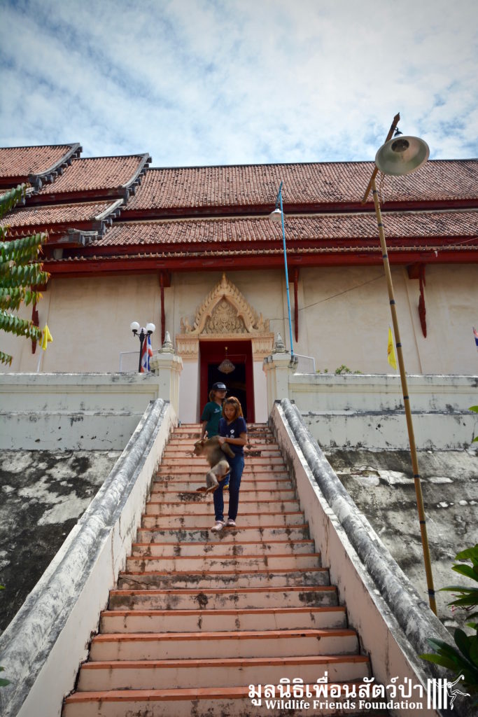 We were told that See Nguen’s previous owner had died when he was an infant, he was then released onto mountain area near the temple, he was then caught, and put in cage. We were told See Thong had been purchased as an infant for 15,000THB (425 USD) and handed over to temple when he was an infant. They have both been at the temple since infancy, spending years in the small barren cages you see in the pictures, with no regular access to drinking or proper diet. After further research about the history of these macaques we were told that they had been brought to the temple to be used as deterrents, to scare away groups of wild urban long-tailed macaques (Macaca fascicularis) that live close to the temple and often come into the temple to look for food. Clearly this did not work as wild long-tailed macaque were visible in the temple.