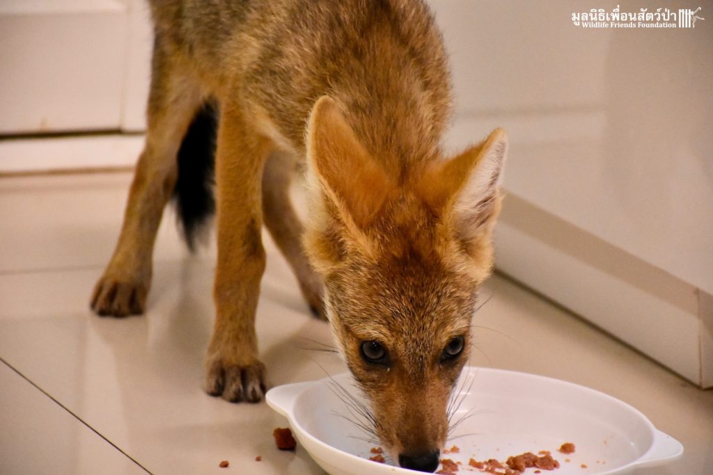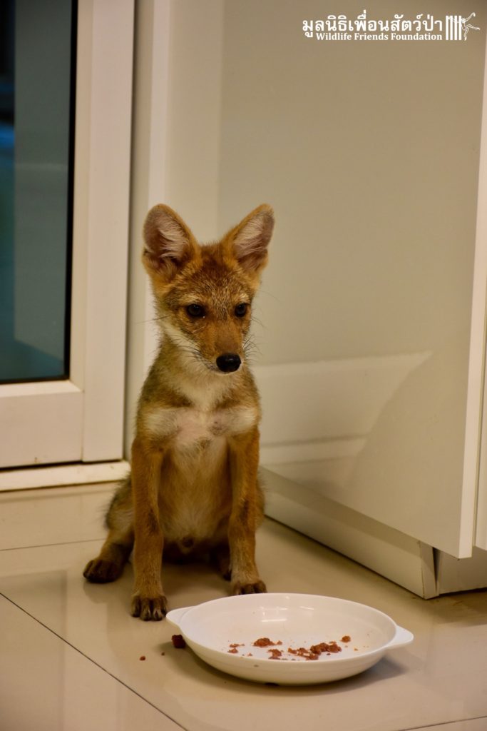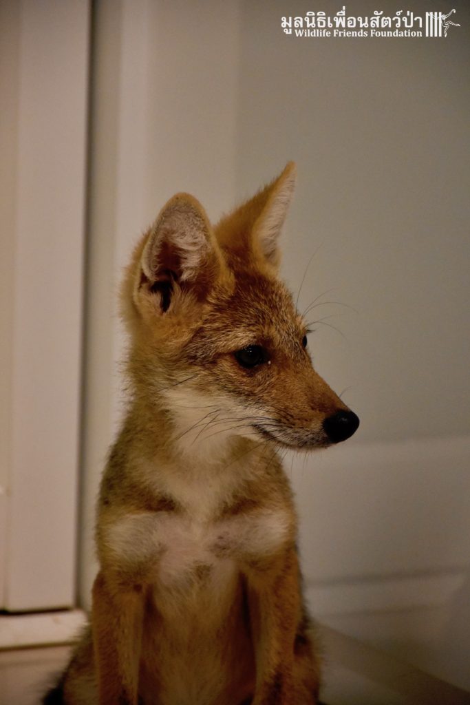 Yesterday an infant Asiatic golden jackal (Canis aureus) was brought into WFFT after being found alone walking through an urban area north of the city of Bangkok. Due to his young age and the location he was found some concerned locals captured him and brought him to the WFFT Wildlife Rescue Centre. We suspect that this little male is a dumped unwanted pet, due to his tameness. This species is particularly fearful of humans and his behavior indicates that is somewhat humanized. He was kept by the people that captured for one week, until the could find a solution, they brought him to WFFT yesterday.