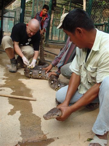 The officials did manage to get the snake into a moving enclosure and took it to the Bangbon municipality while waiting for the WFFT rescue team to arrive with the Care for the Wild mobile wildlife clinic. When Dr Mark Jones arrived at the scene the injuries were found to be too large and deep to have the snake released immediately.