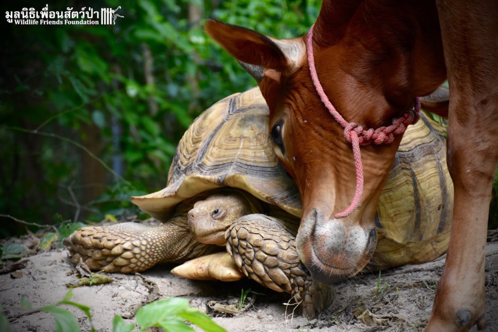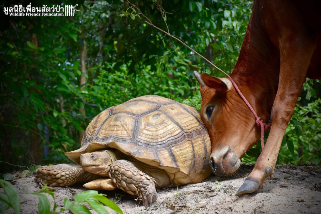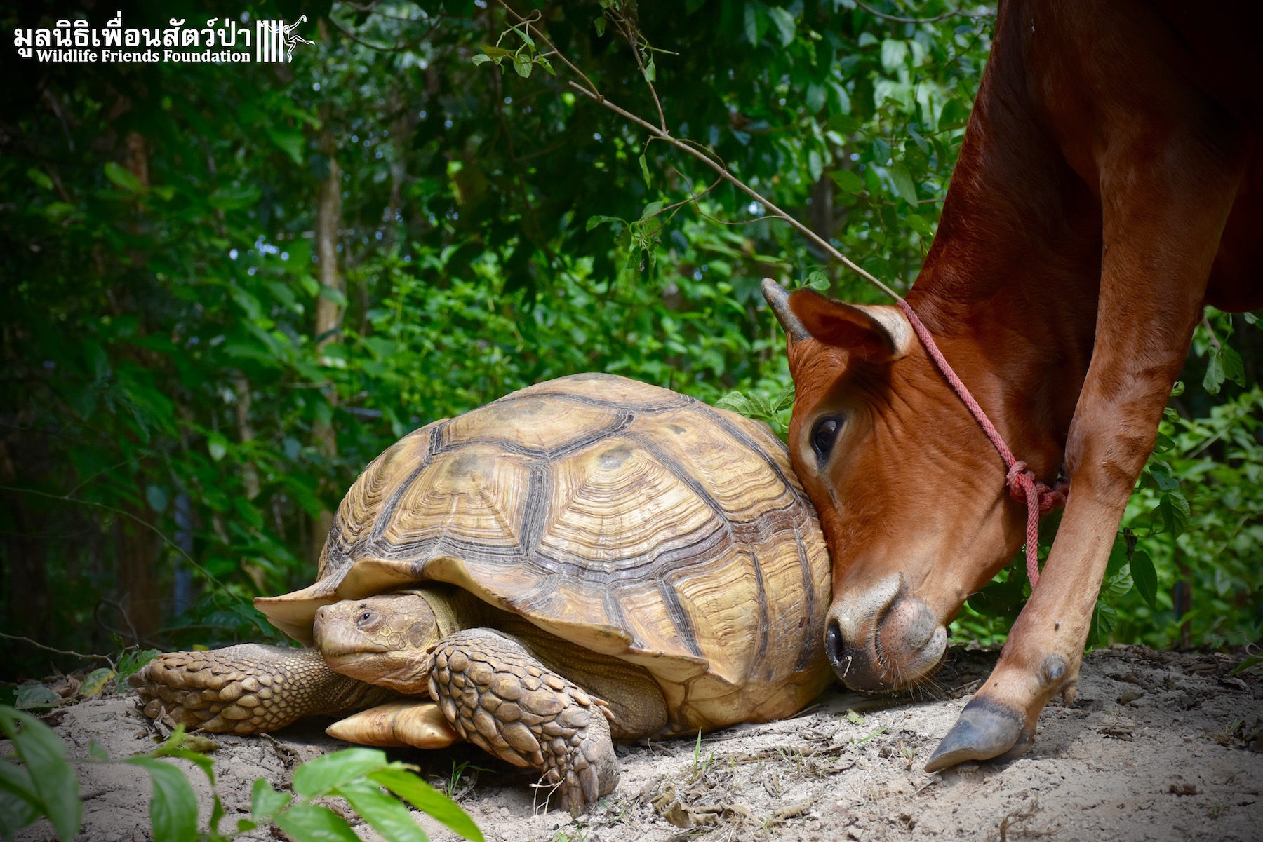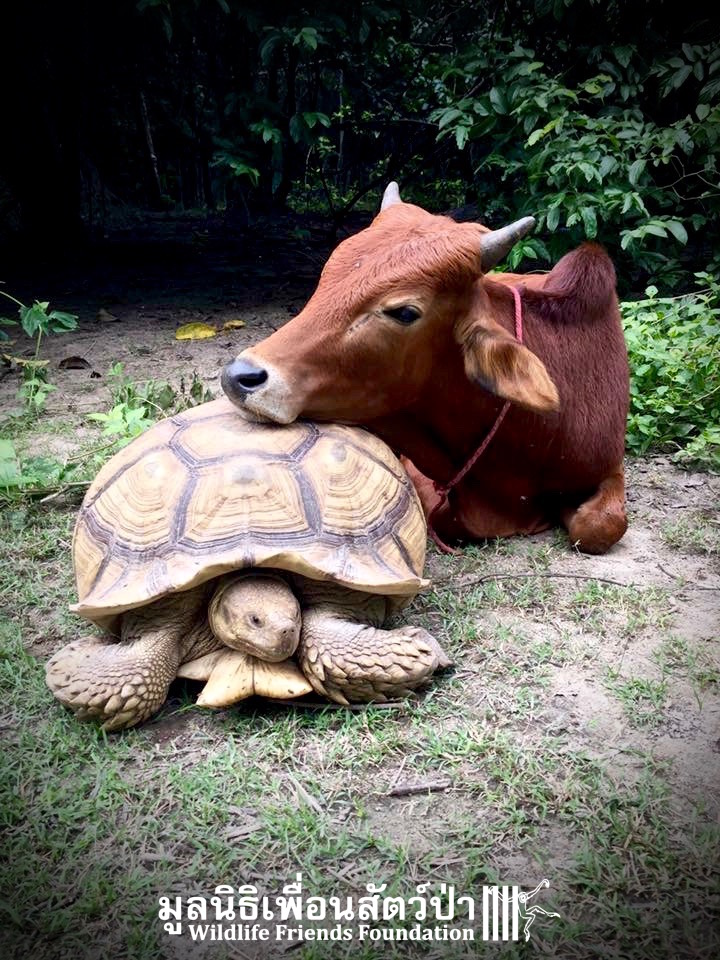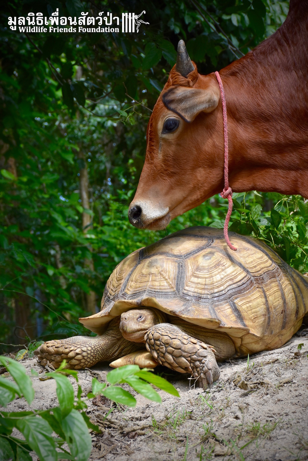 Introducing one of the most unlikely interspecies friendships we have ever seen here at the WFFT Wildlife Rescue Centre, ‘Simon Cow-ell’ the domestic cow and Leonardo the African spurred tortoise (Centrochelys sulcata). Simon has been with us since February this year after being caught in vine, resulting in serious injuries, while out crazing with his mother. Part of one of his hind legs had fallen off due to this injury, see his story here http://bit.ly/2fWk1rk, Leonardo was rescued from a Bangkok zoo in 2013, after closure of the zoo.