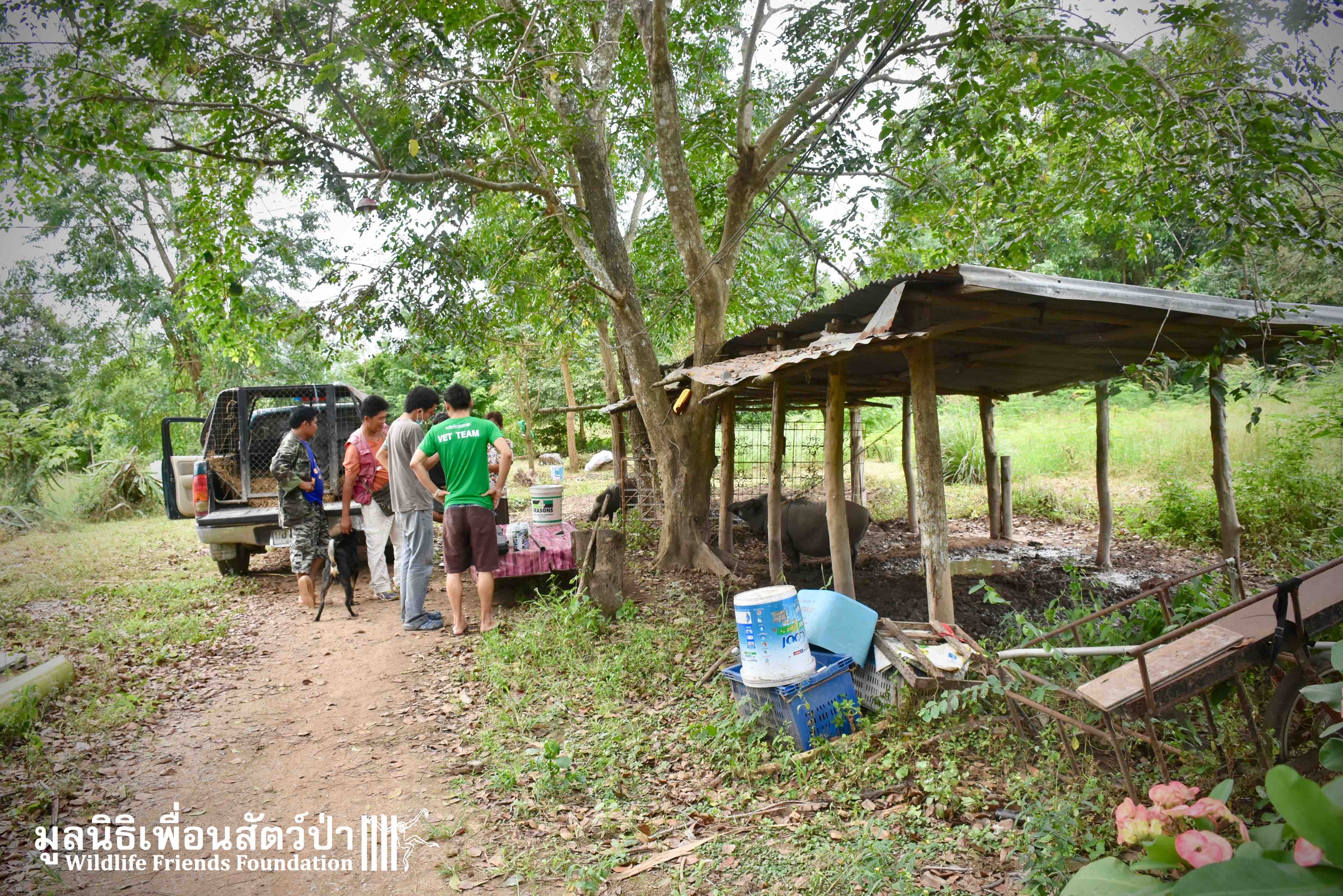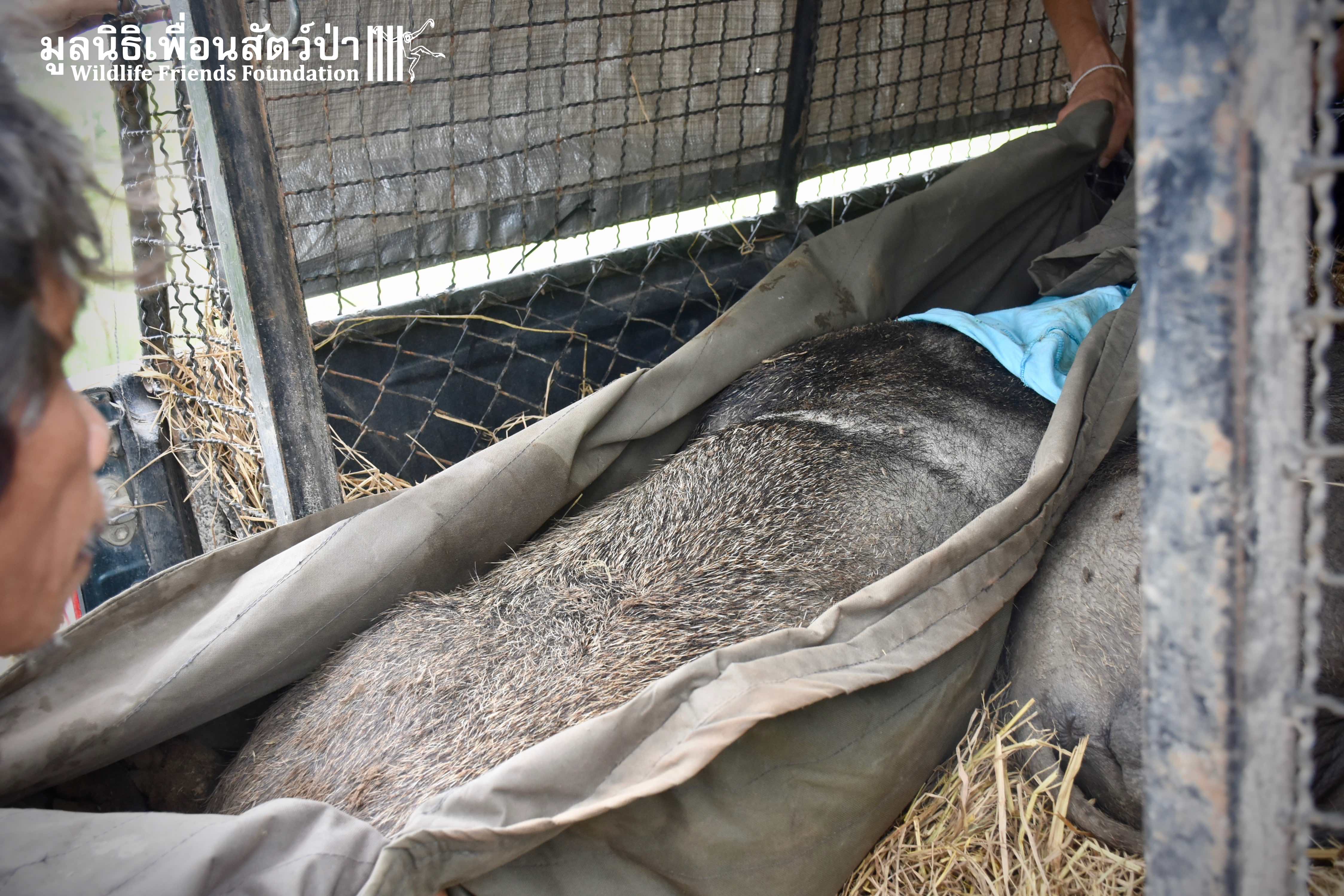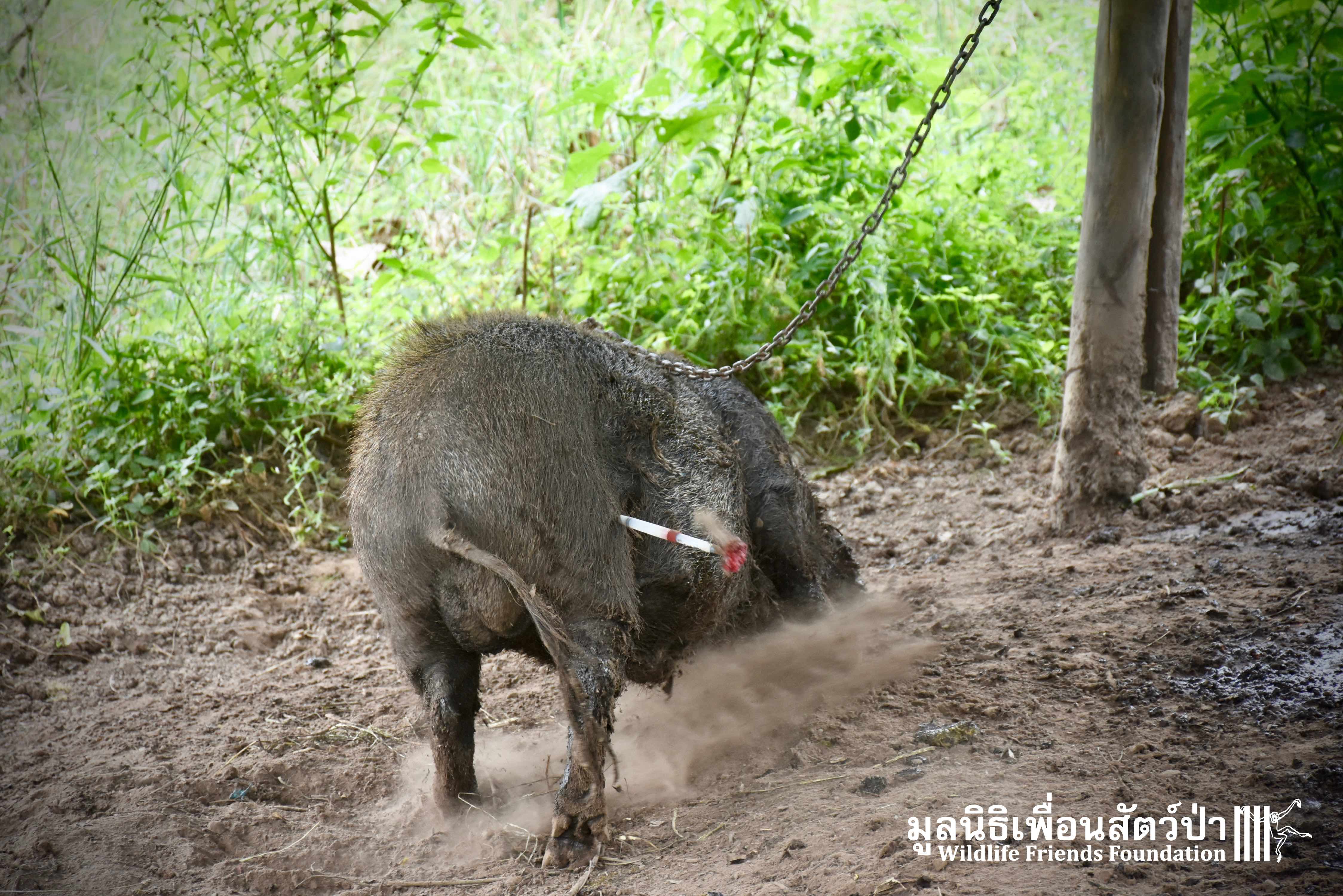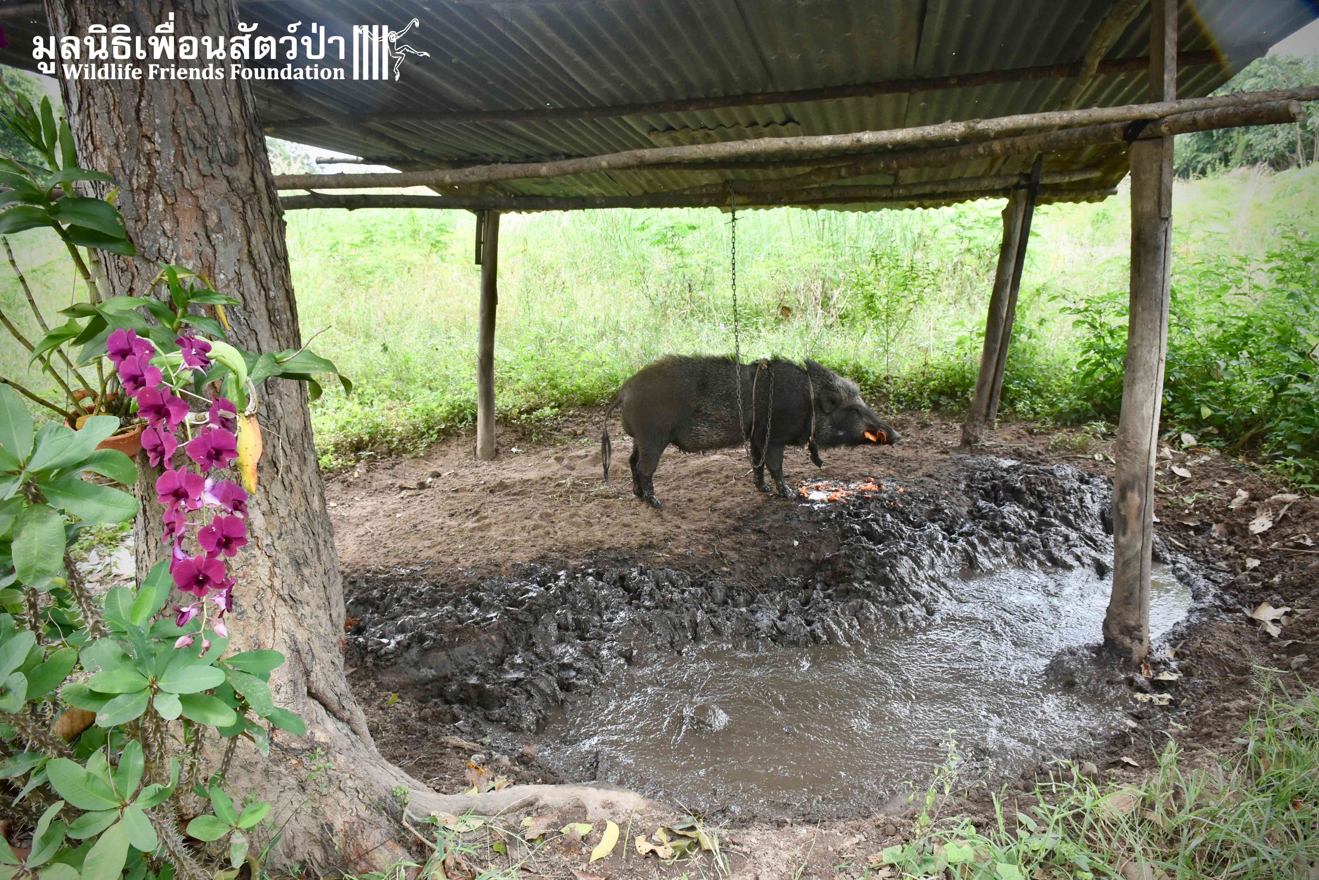 On their arrival at WFFT rescue centre, Som Boon & Pun Pon were placed in 2 side enclosures next to our large forested wild boars enclosure. Hopefully they will soon join the herd and meet Simon (our 3 legs cows). We will keep you updated on our 2 new residents and their new non-domestic life.