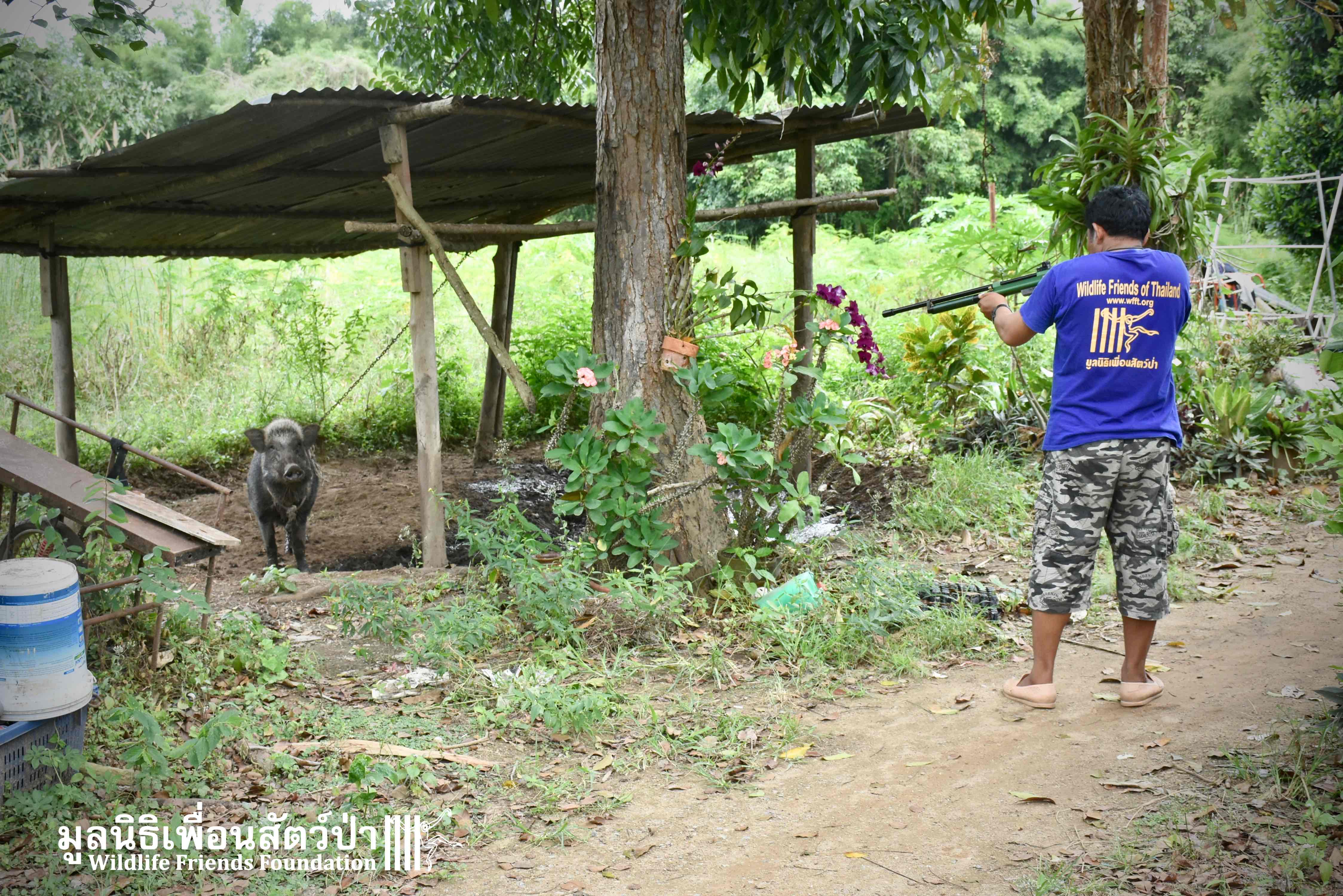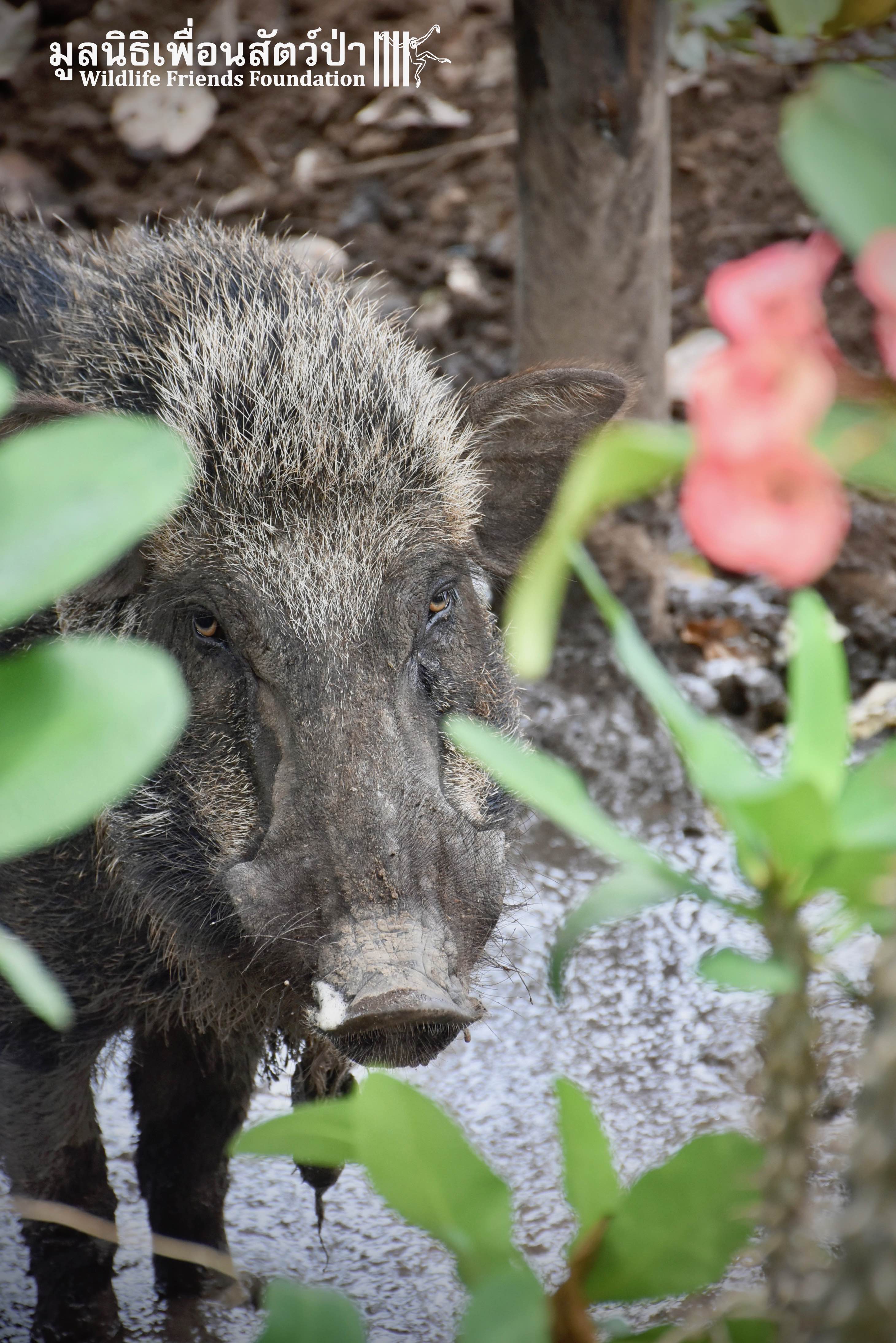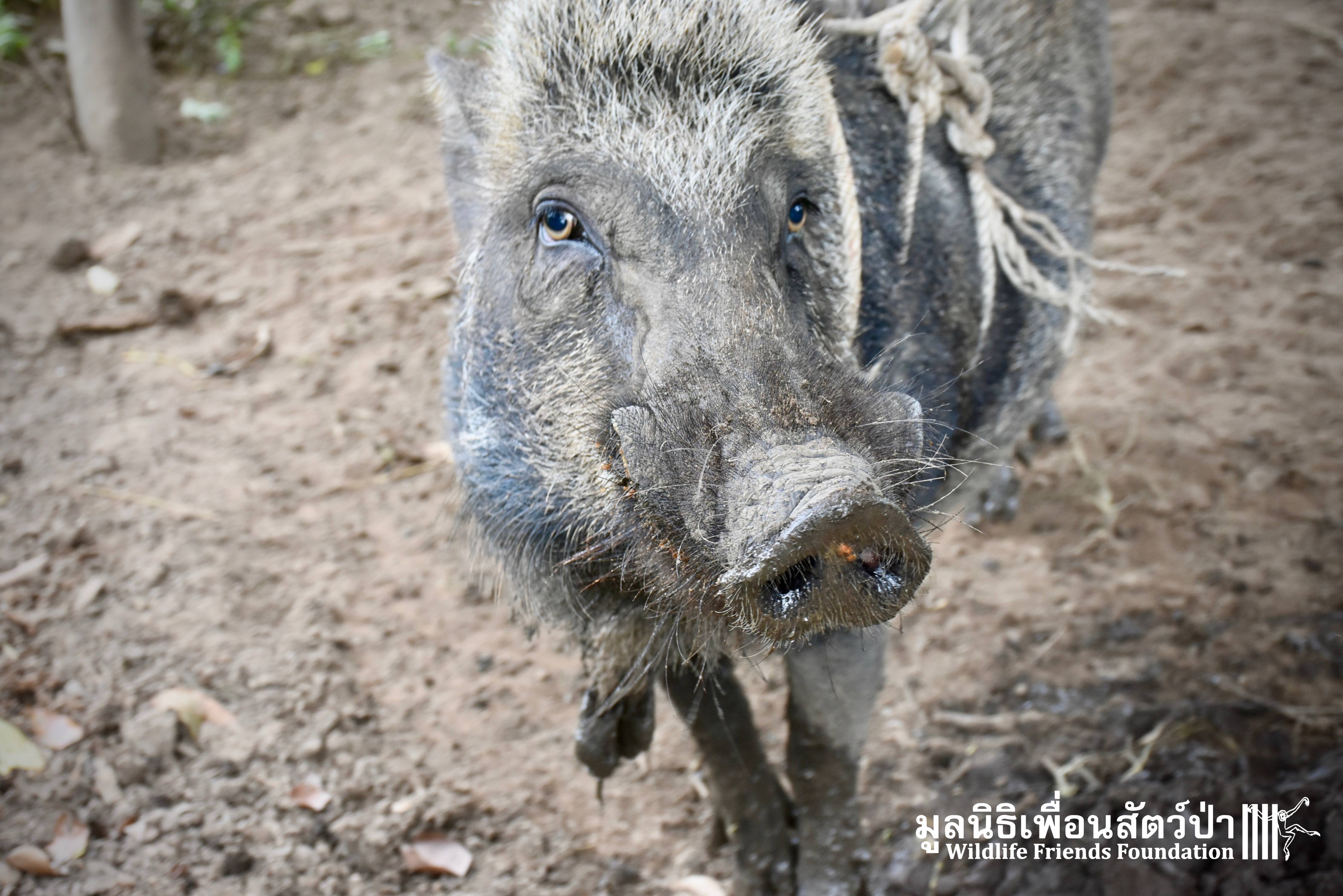 8 years prior, a pregnant female boar had escaped from a farm nearby, and arrived at their home. The mother gave birth to 4 babies: two males (Som Boon & Pun Pon) and two females. The mother was killed by hunters, the family took care of the babies. Hand rearing them from 3 days old, feeding them every 2 hours. They quickly grew and the family continued to take care of them as best they could.