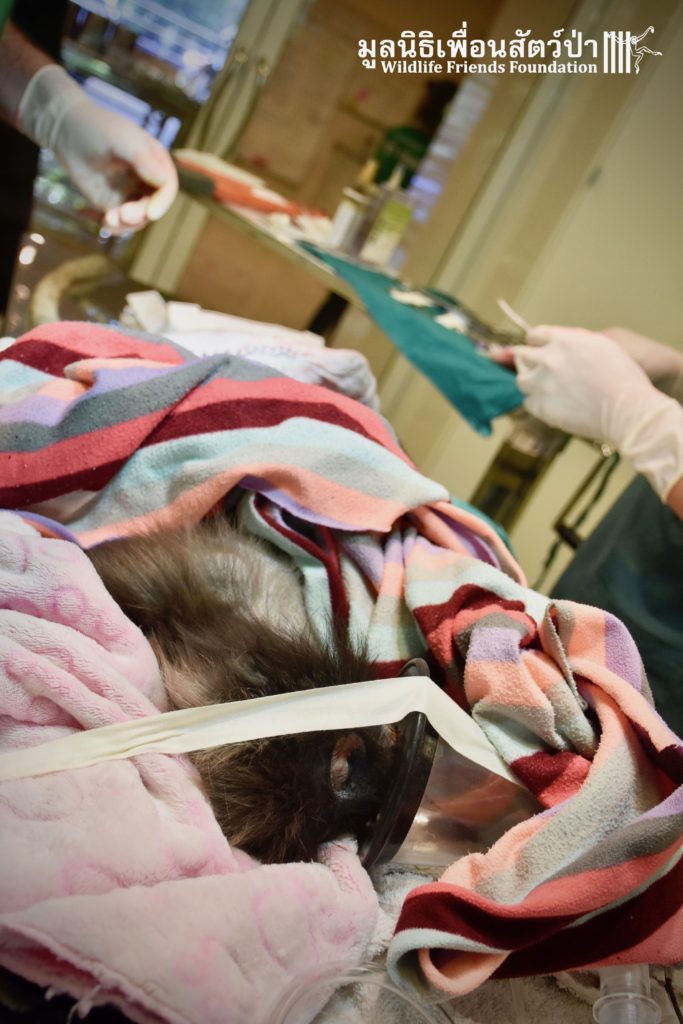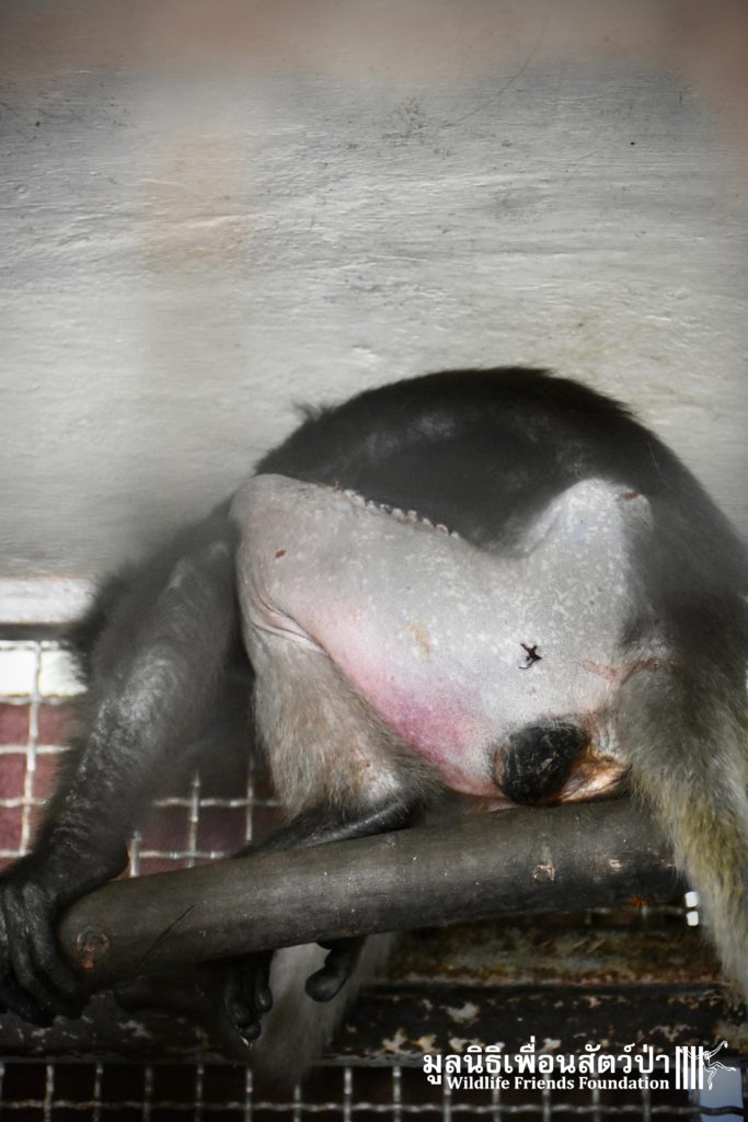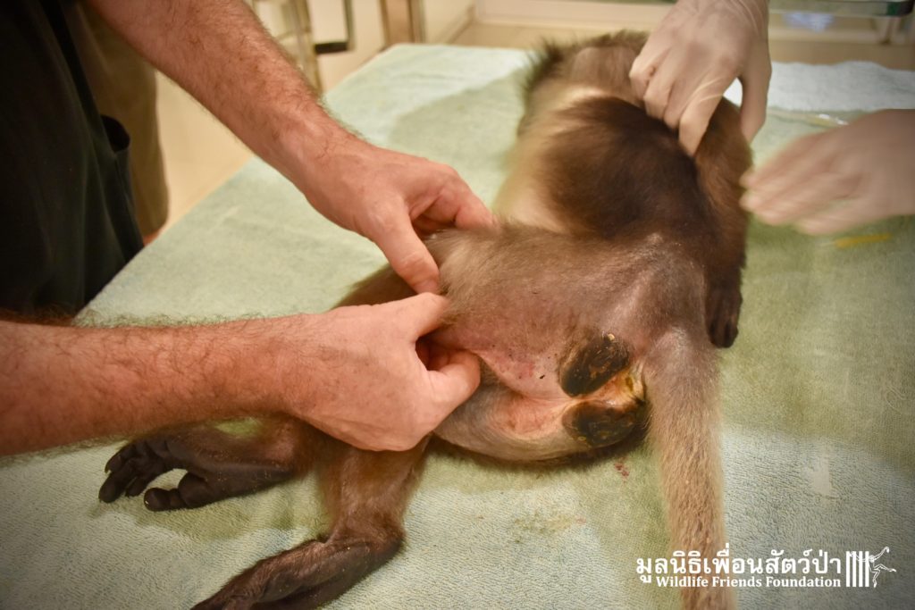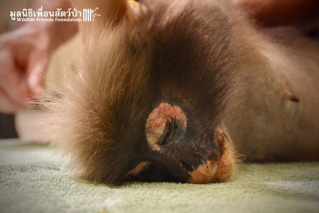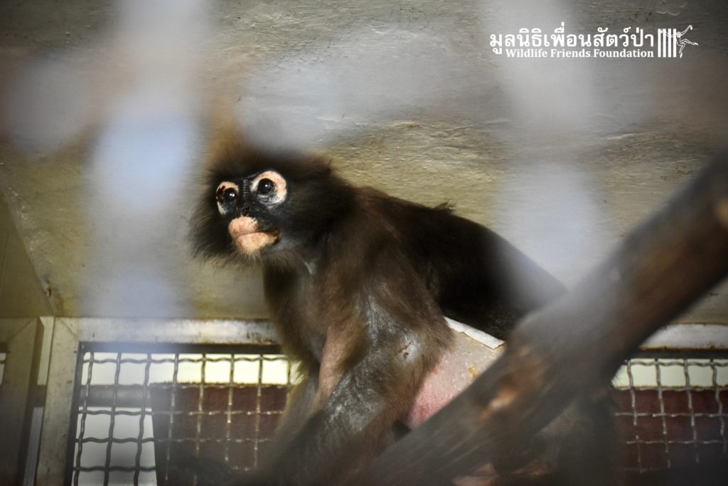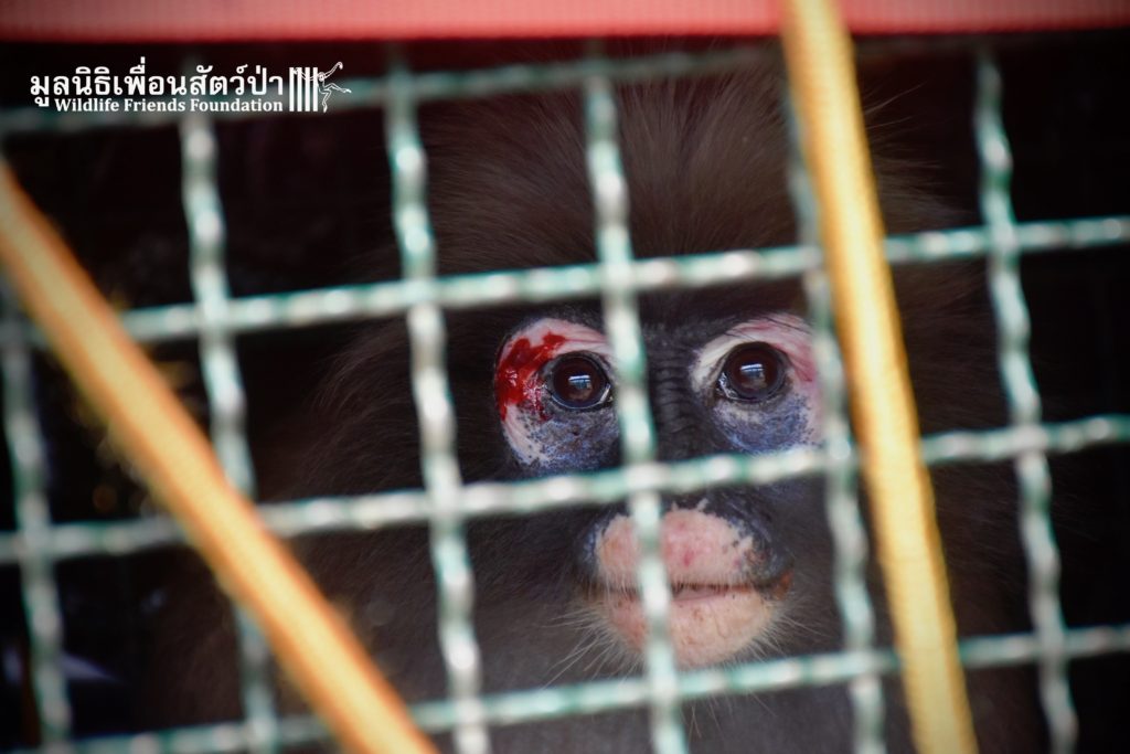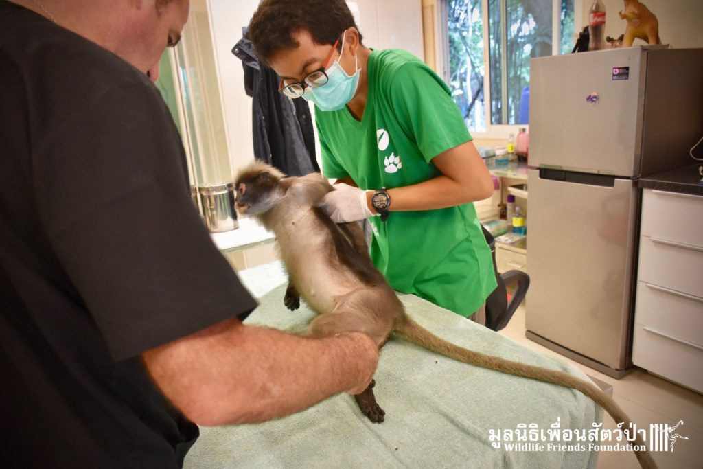 Earlier this week we received a telephone call from a human rescue team in the South of Thailand about an injured monkey in need of emergency rescue. The animal in question was a female dusky langur (Trachypithecus obscurus), she had been involved a collision with a road vehicle and has sustained severe injuries to the left leg. The accident occurred 4 hours south of the WFFT Wildlife Rescue Centre, the team headed out immediately to try a save this special primate.