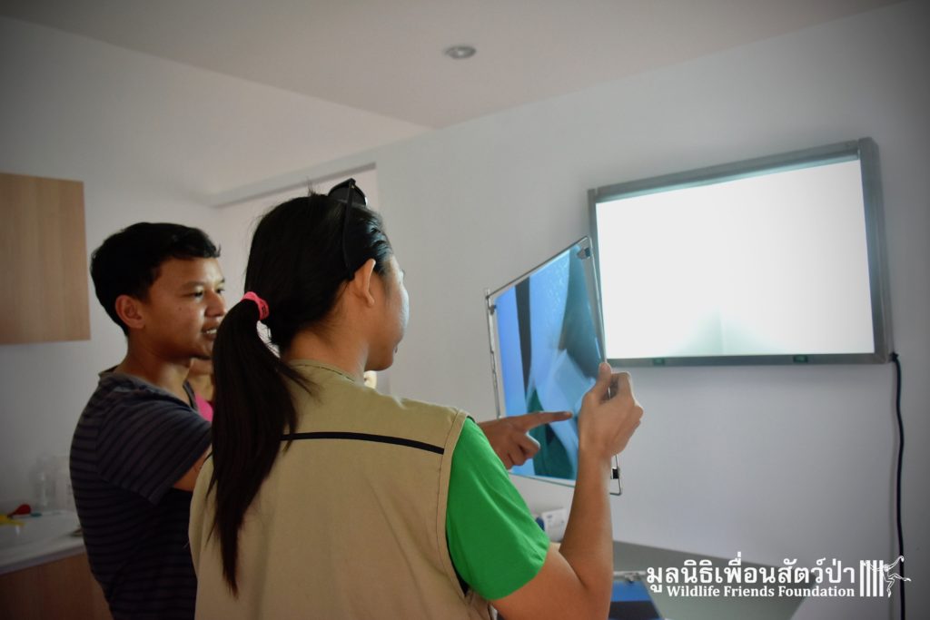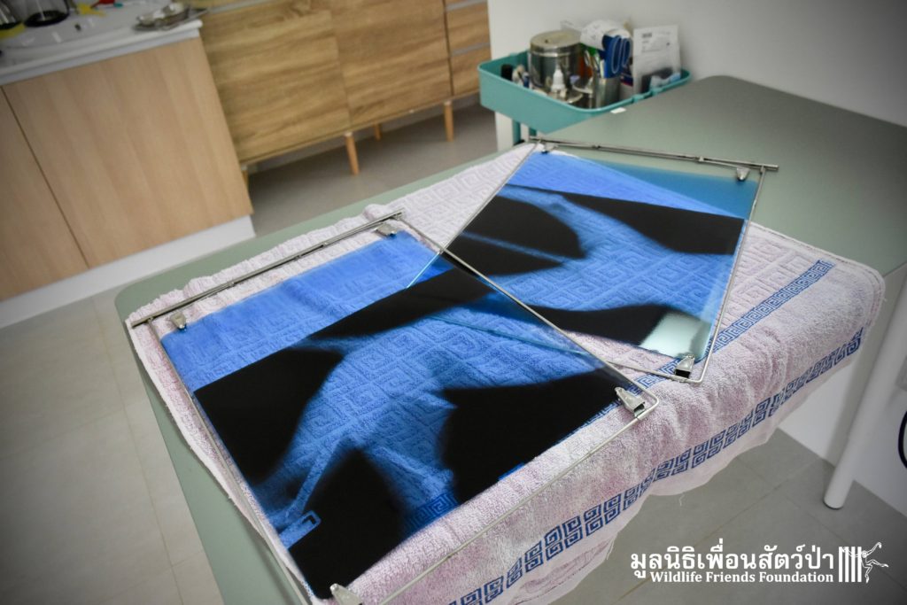 Open arrival to the scene the found a rather stressed langur with a very badly injured leg. The injured leg was visibly broken. To evaluate the situation further and access the damage the team took her to a local clinic to perform an x-ray, you can see the extent of the fracture from the images of the x-ray.