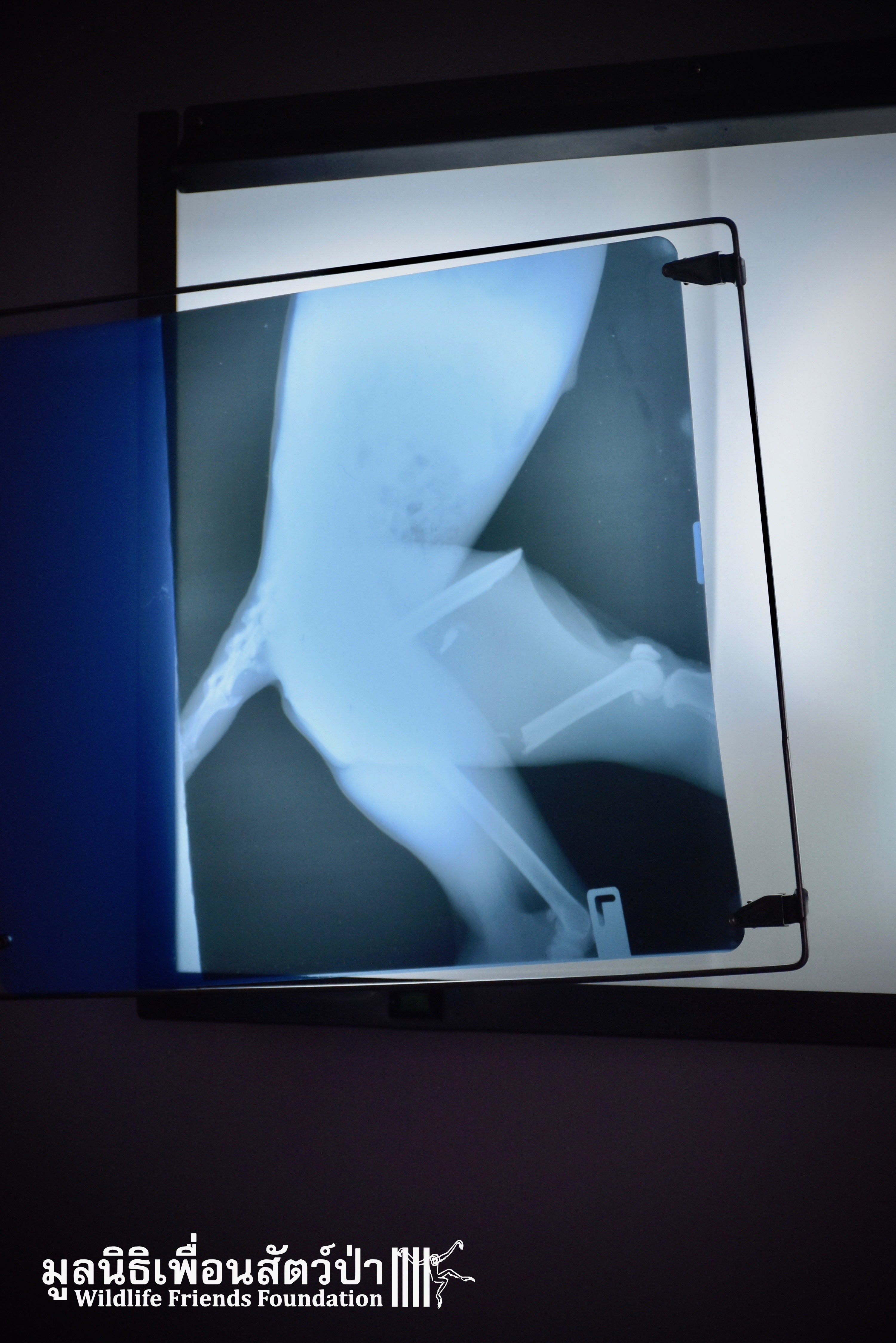 Open arrival to the scene the found a rather stressed langur with a very badly injured leg. The injured leg was visibly broken. To evaluate the situation further and access the damage the team took her to a local clinic to perform an x-ray, you can see the extent of the fracture from the images of the x-ray.