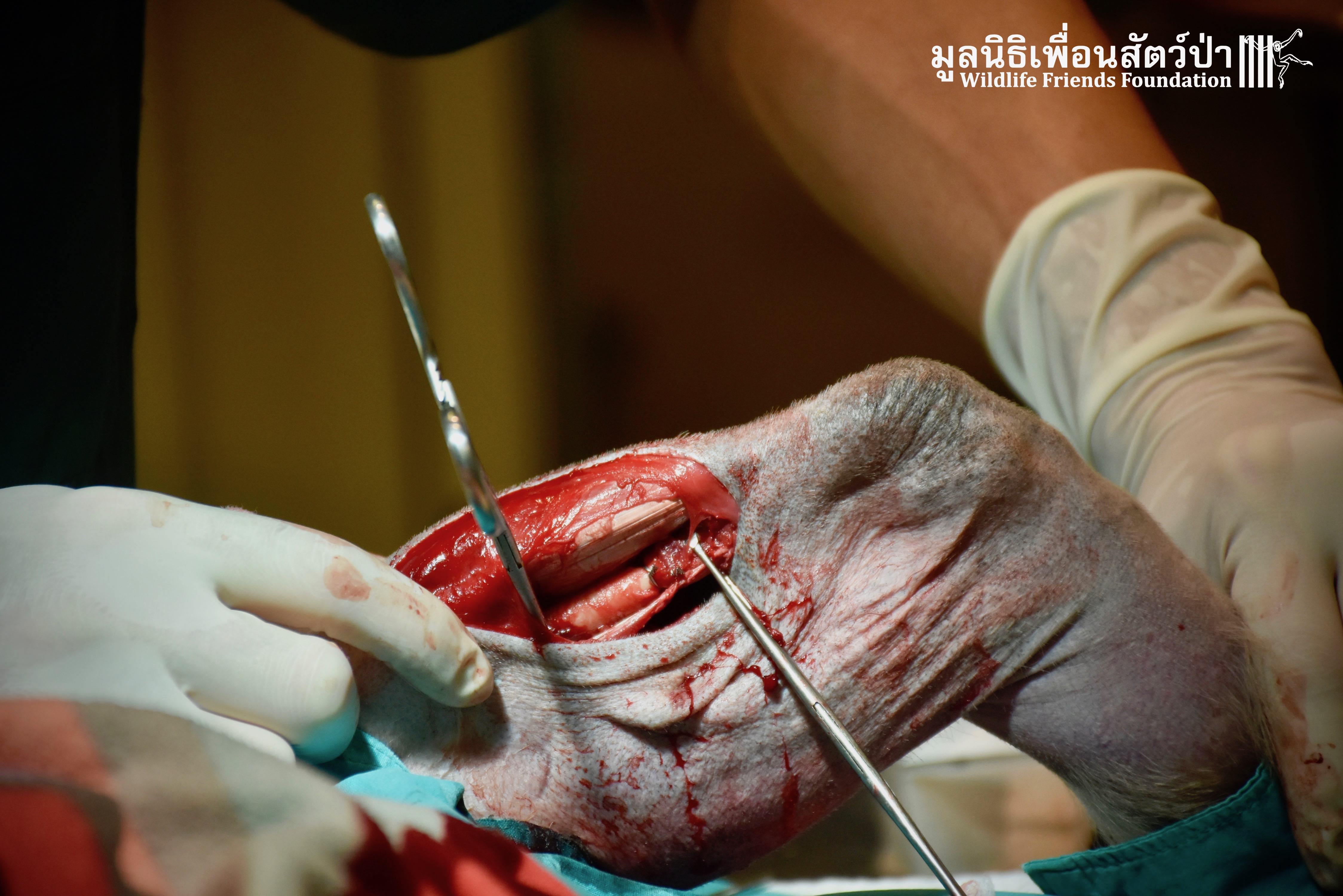 The team, planned to perform surgery the following day. The team agreed to try save the leg as without her leg a wild life would be difficult. The vet team inserted an intramedullary pin through the bones of her leg to re-joined the bones. So far the surgery seems a success, we will only be able to confirm this the coming days and weeks. We have named her ‘Rosy’. Rosy is currently recovering from her ordeal in the WFFT Wildlife Hospital in a small recovery enclosure to restrict her movement so her leg can have a chance to heal.