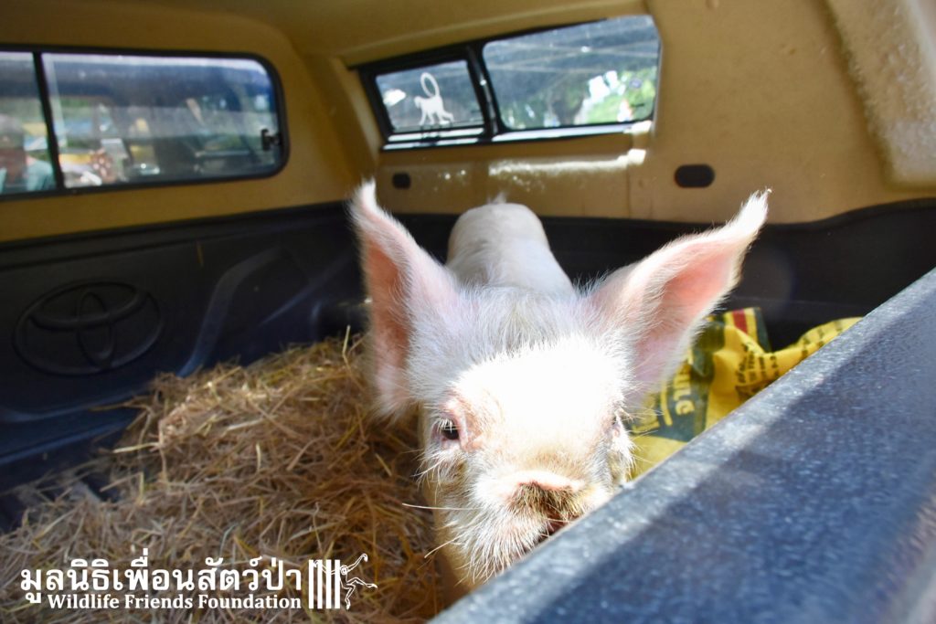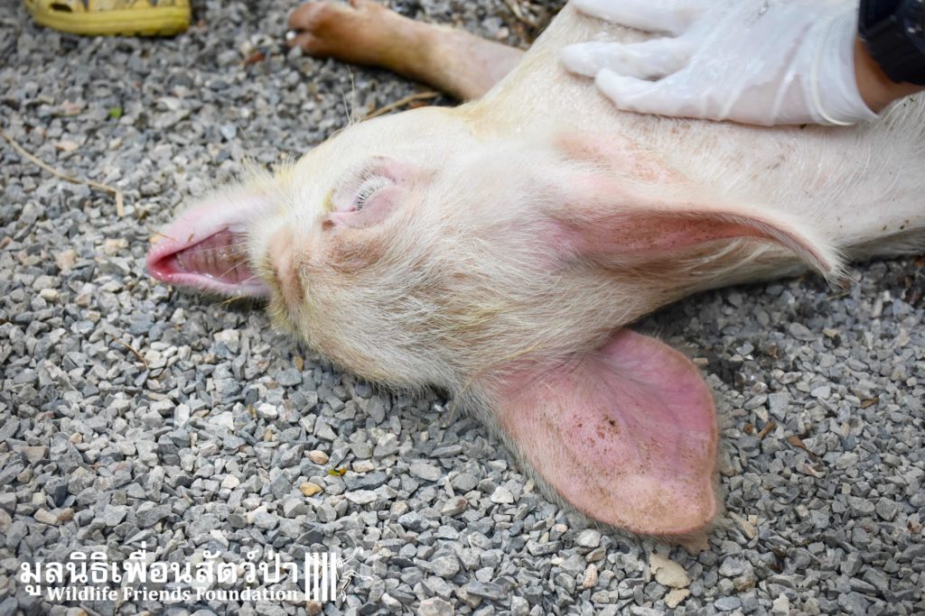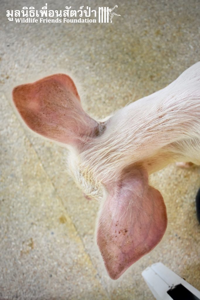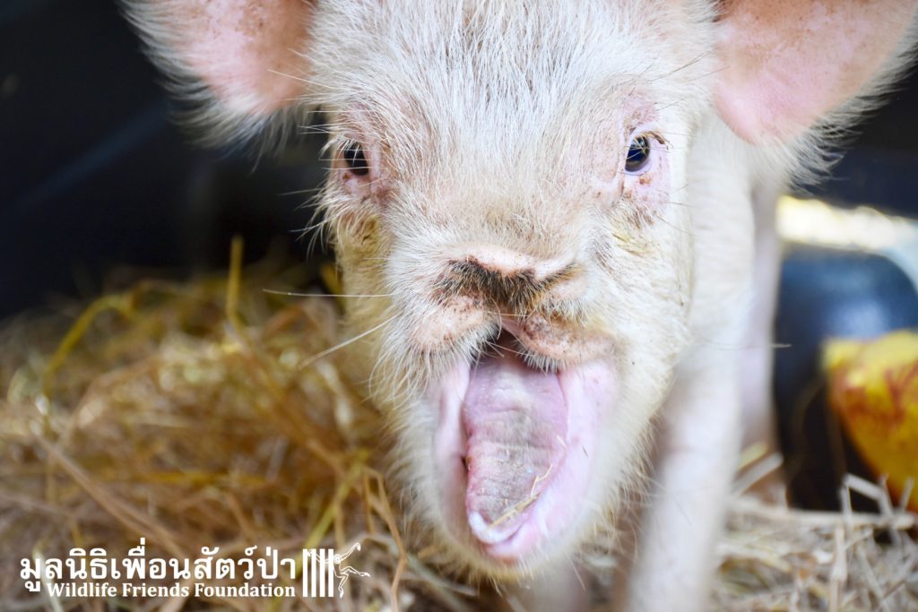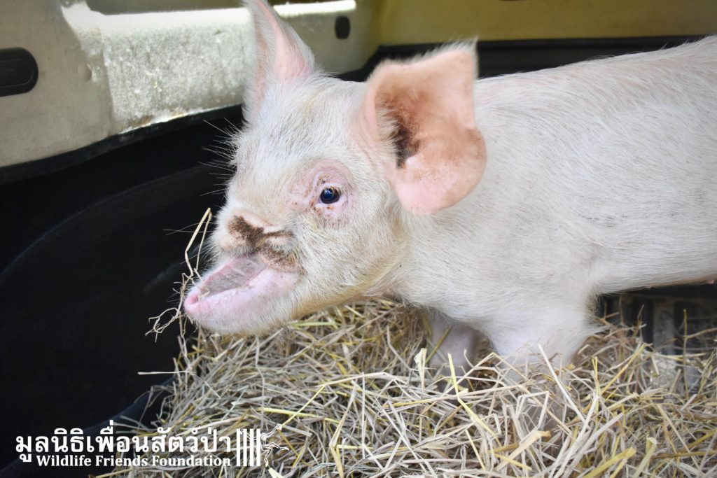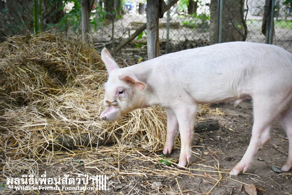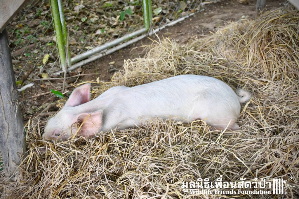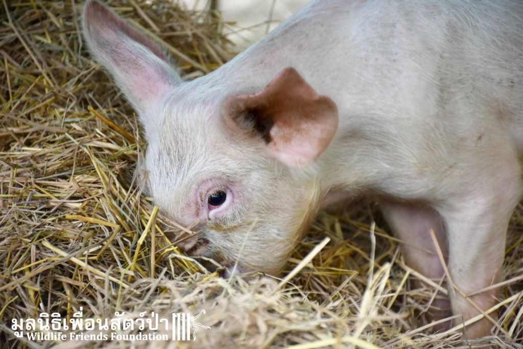 This young pig had been saved from drowning in a river by some concerned members of the public. They managed to save him and take him to the Phetchaburi Livestock Dept. office, who then called us for help. The vets at the Livestock Dept. knew that WFFT could provide this little guy with a new life. The WFFT Rescue Team went to collect this rather distinctive looking little guy. Upon arrival to WFFT Babe was given his own special quarantine pen, with a pool, a little shelter and ample amounts of freshly cut hay, which he absolutely loves to role around and sleep in. We estimate that Babe is around 3 months old.