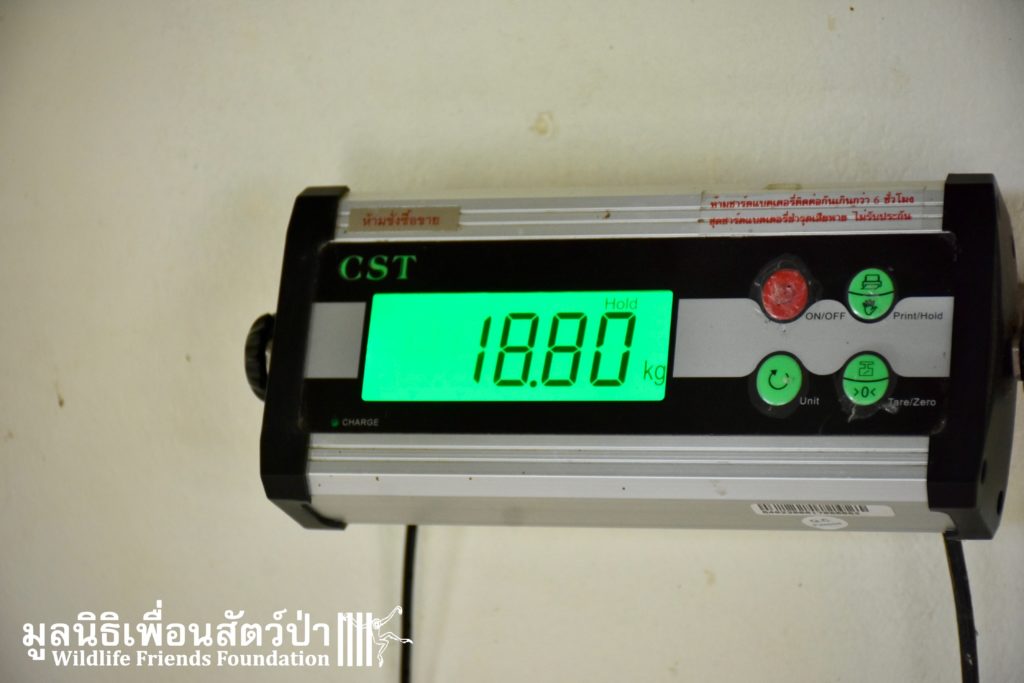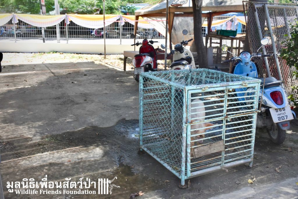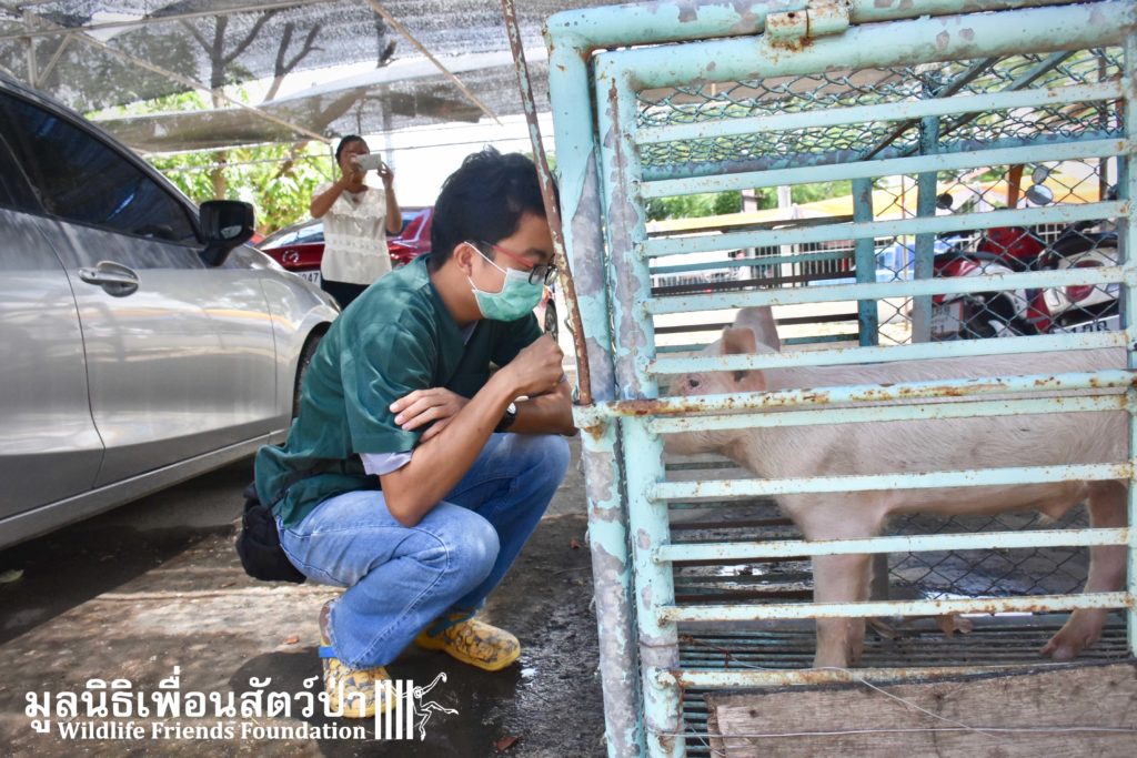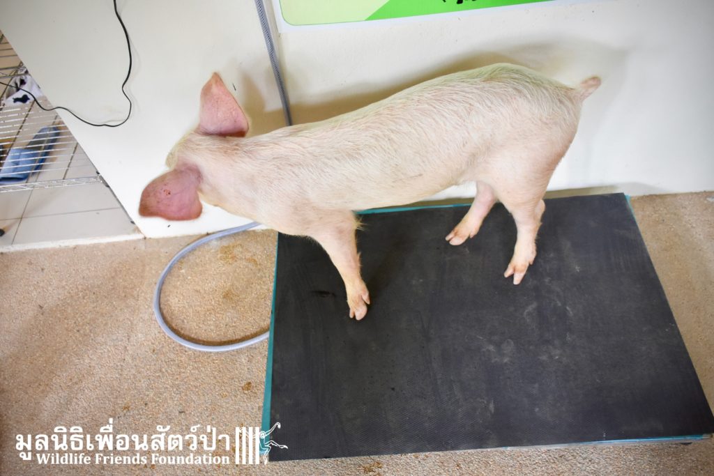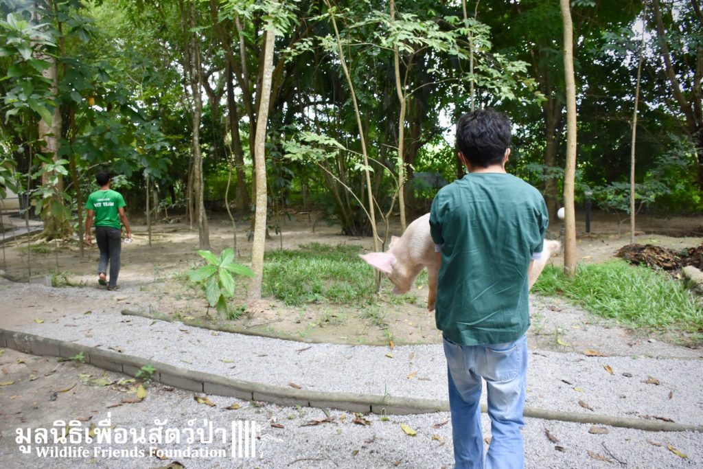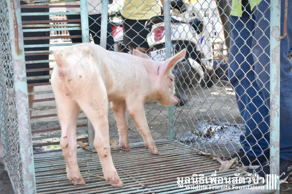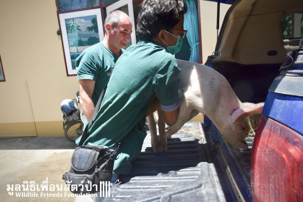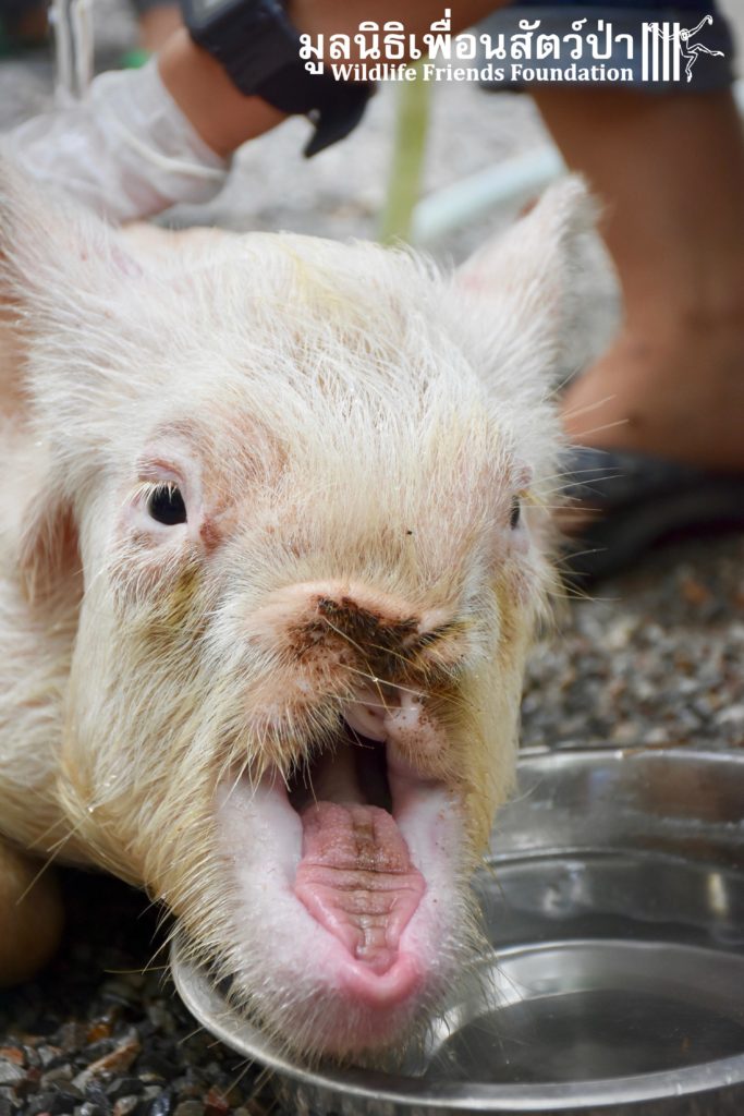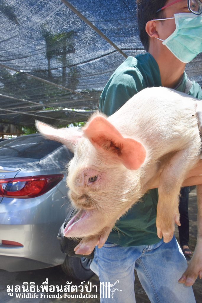This young pig had been saved from drowning in a river by some concerned members of the public. They managed to save him and take him to the Phetchaburi Livestock Dept. office, who then called us for help. The vets at the Livestock Dept. knew that WFFT could provide this little guy with a new life. The WFFT Rescue Team went to collect this rather distinctive looking little guy. Upon arrival to WFFT Babe was given his own special quarantine pen, with a pool, a little shelter and ample amounts of freshly cut hay, which he absolutely loves to role around and sleep in. We estimate that Babe is around 3 months old.