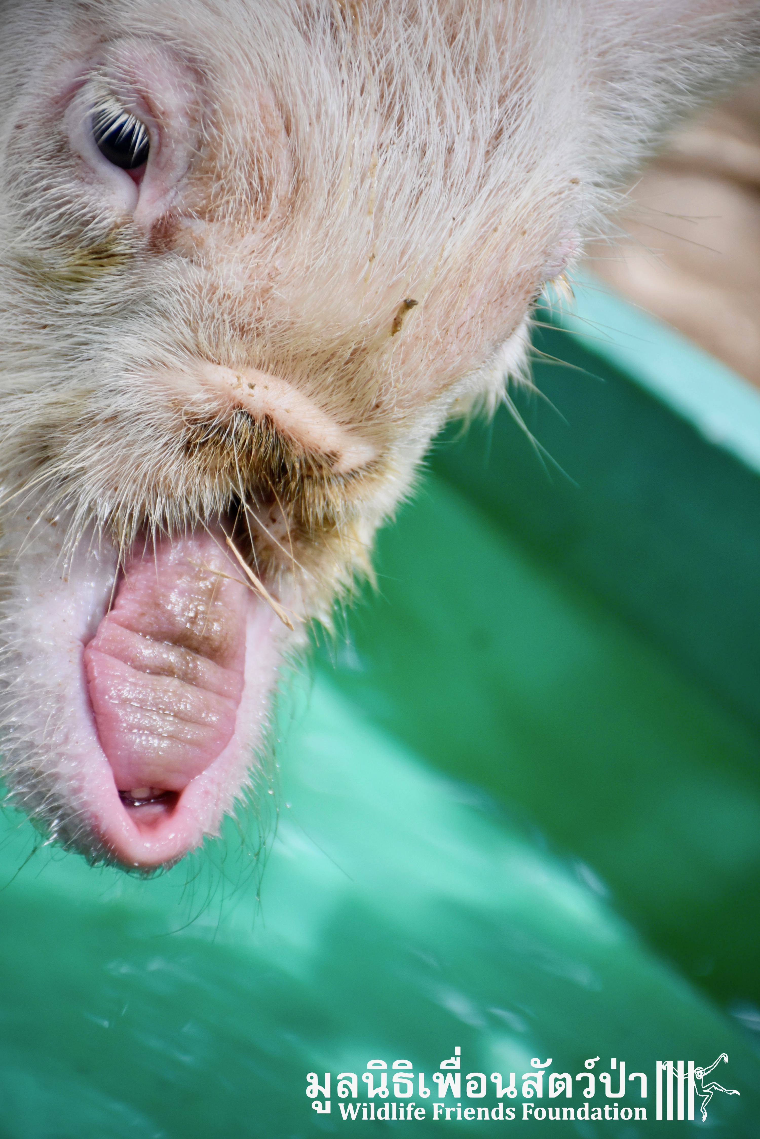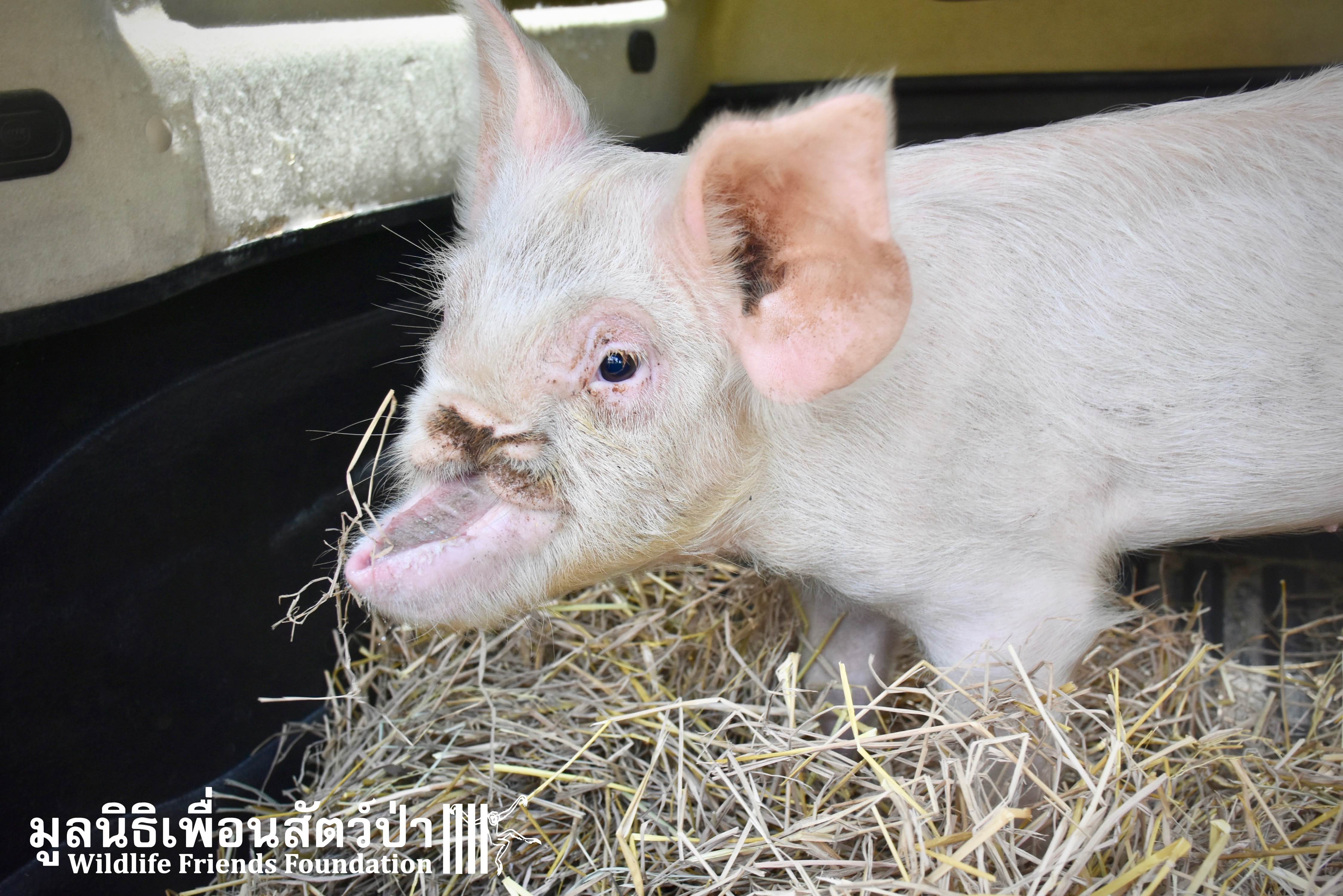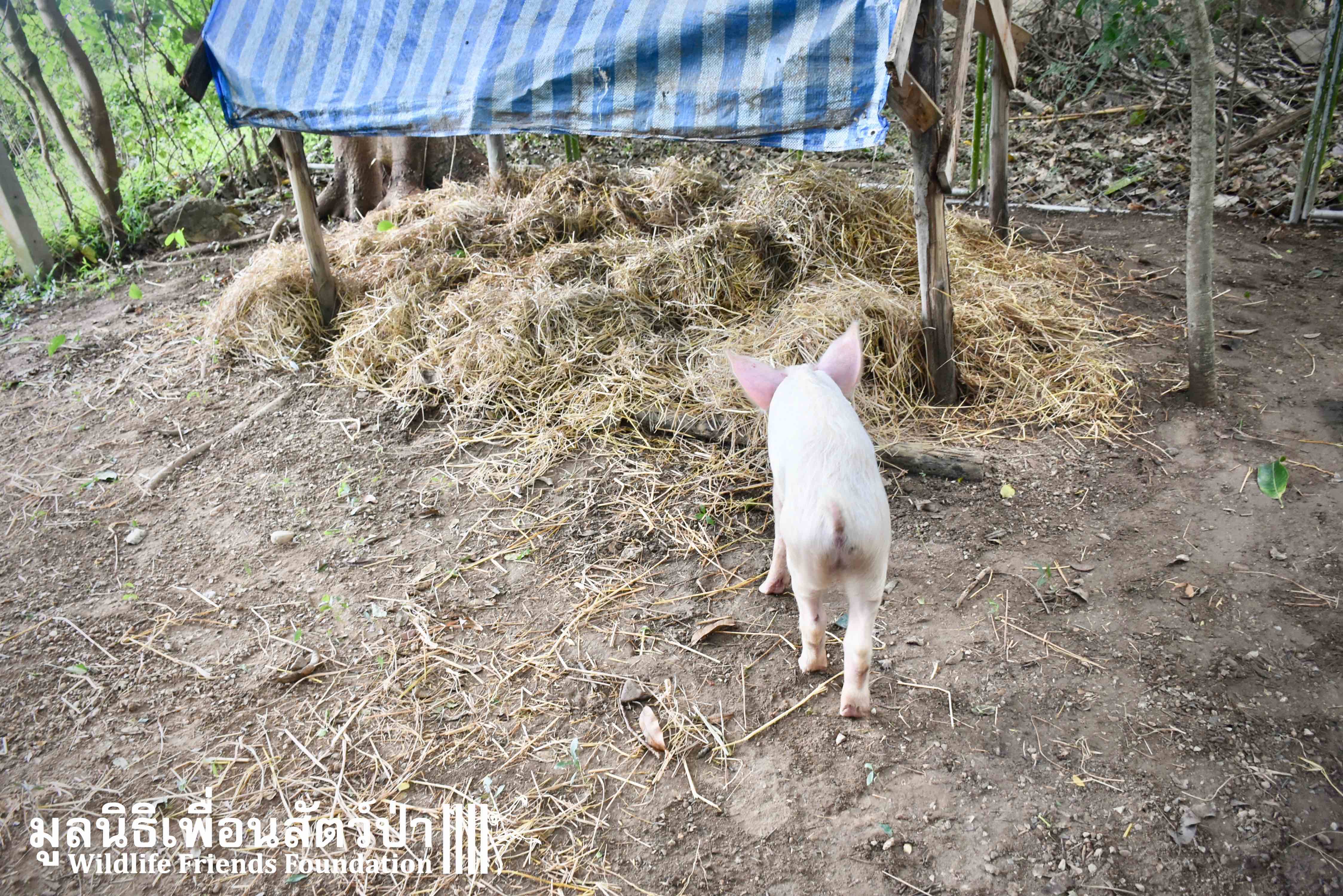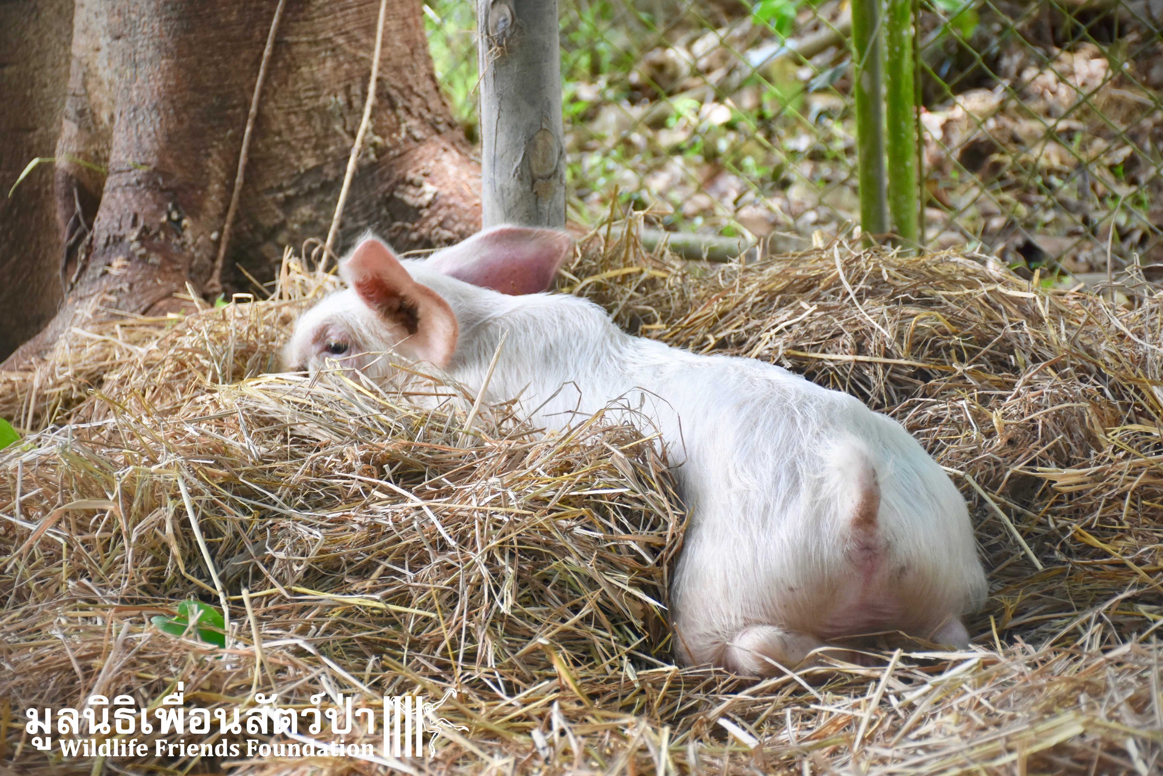 This young pig had been saved from drowning in a river by some concerned members of the public. They managed to save him and take him to the Phetchaburi Livestock Dept. office, who then called us for help. The vets at the Livestock Dept. knew that WFFT could provide this little guy with a new life. The WFFT Rescue Team went to collect this rather distinctive looking little guy. Upon arrival to WFFT Babe was given his own special quarantine pen, with a pool, a little shelter and ample amounts of freshly cut hay, which he absolutely loves to role around and sleep in. We estimate that Babe is around 3 months old.