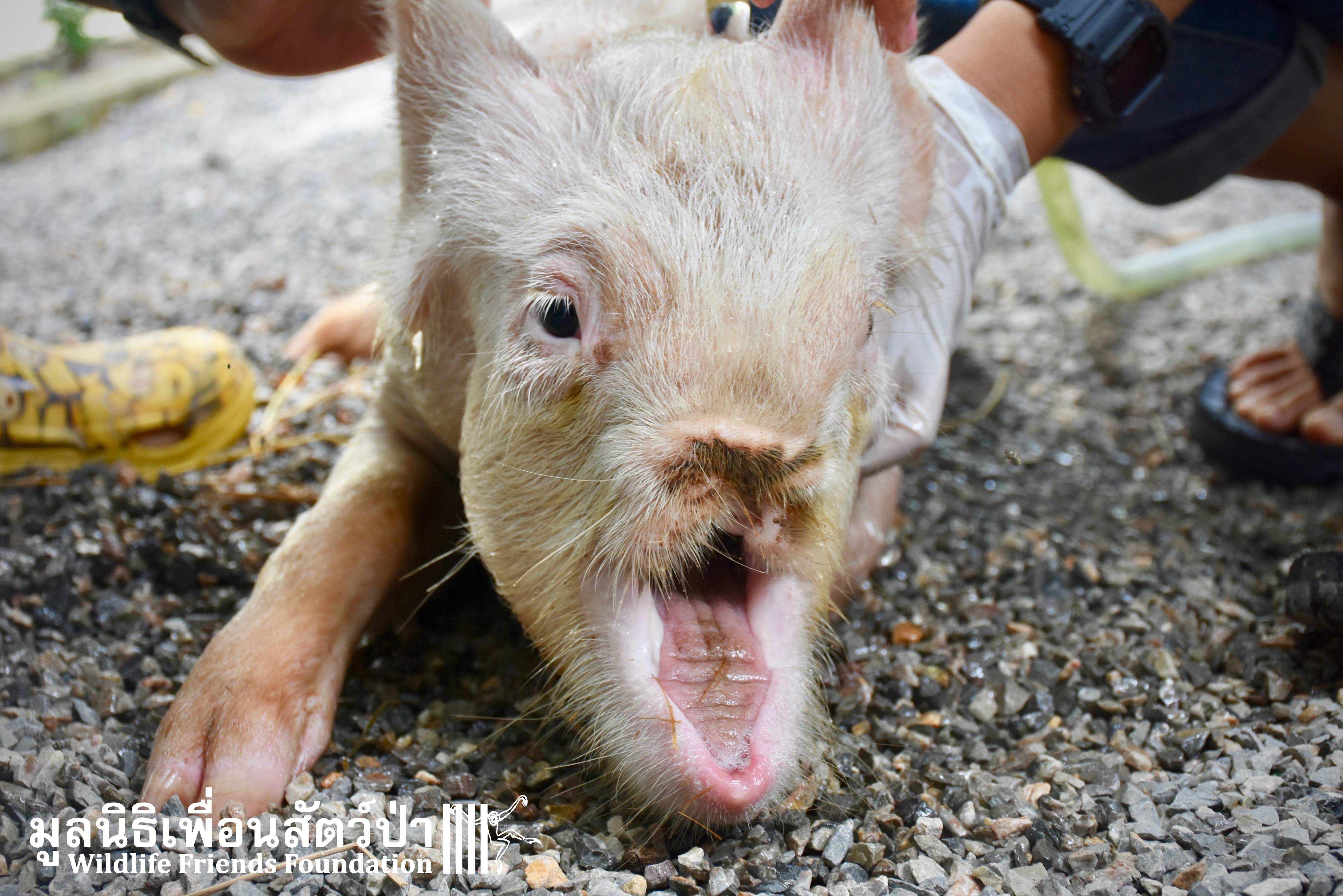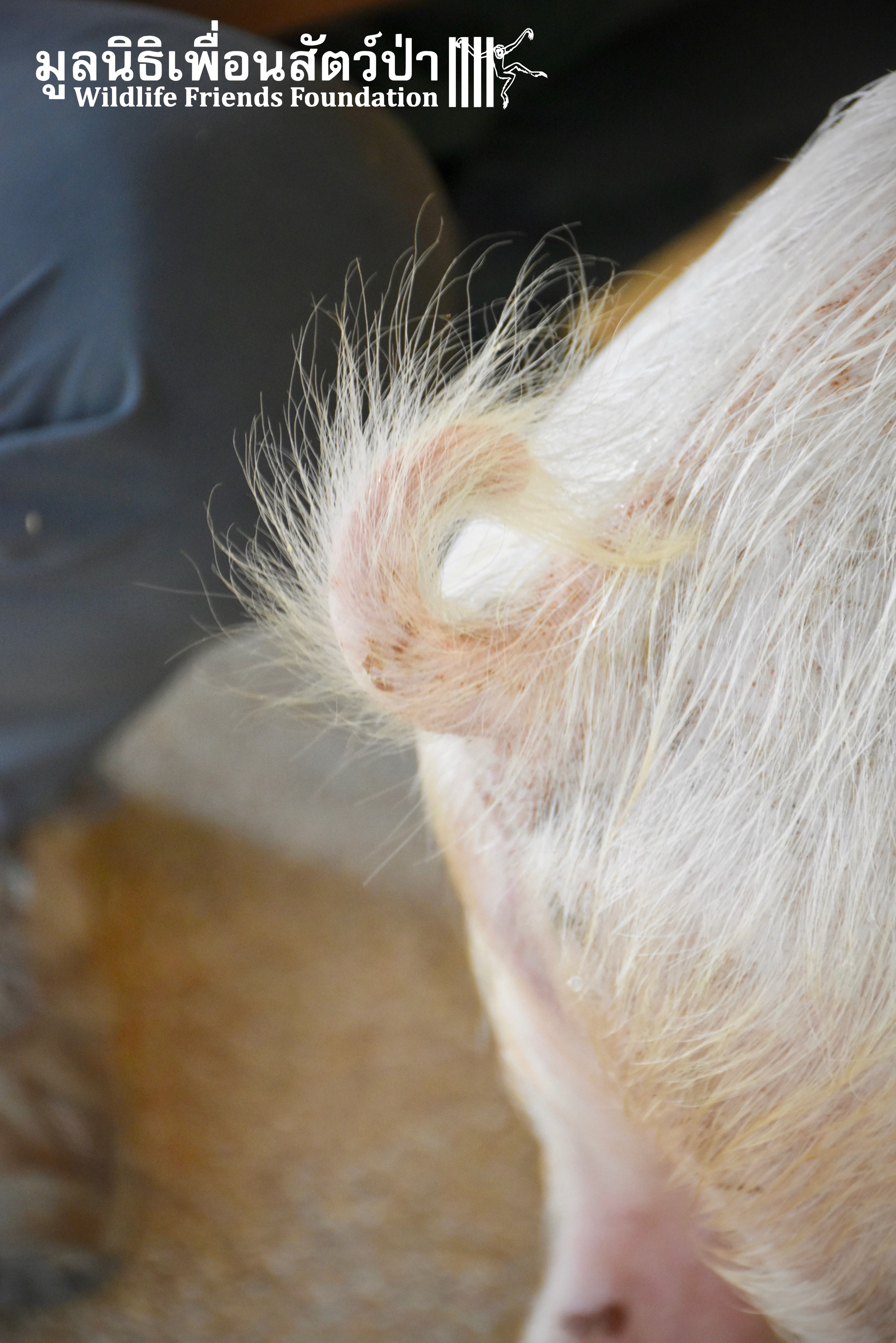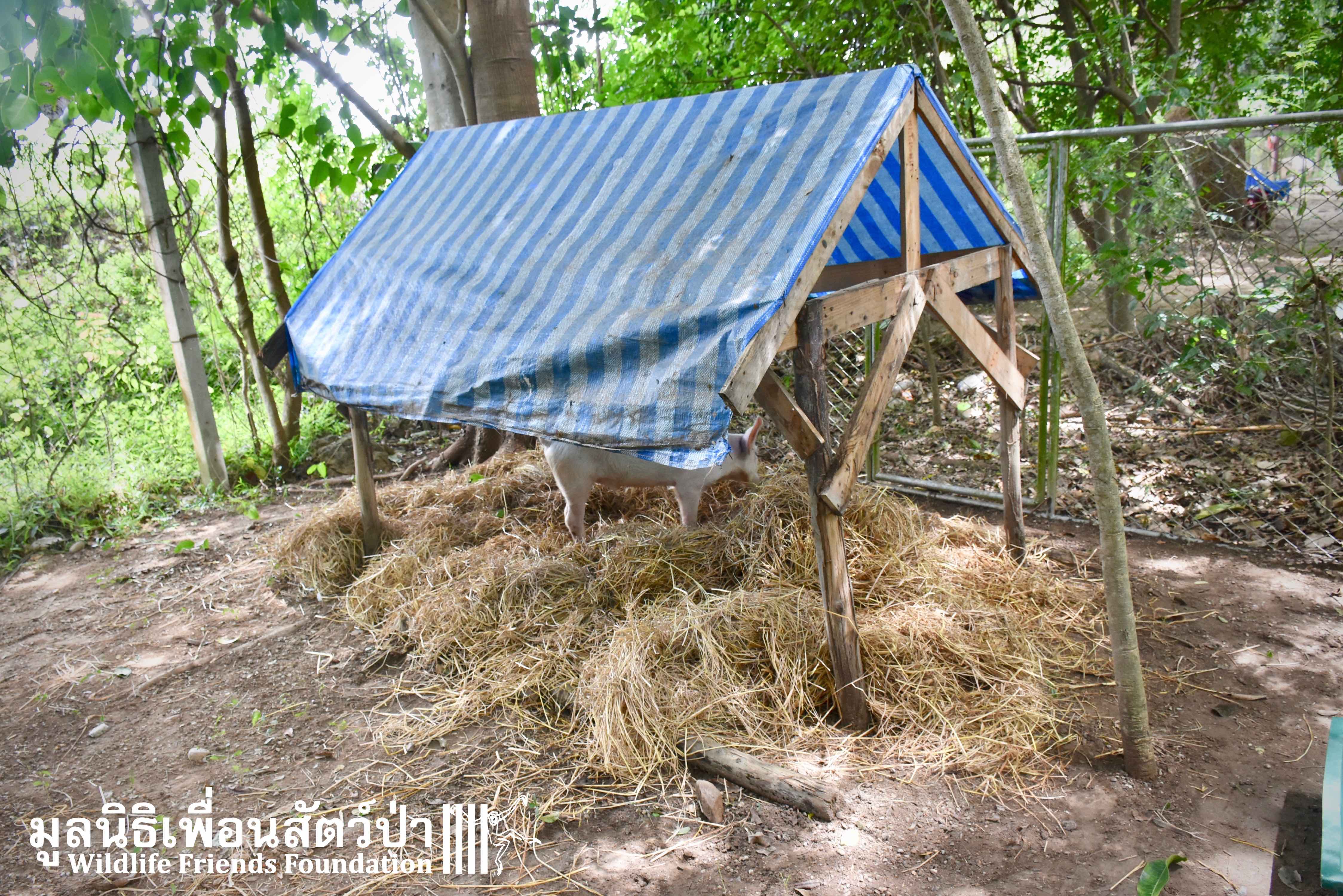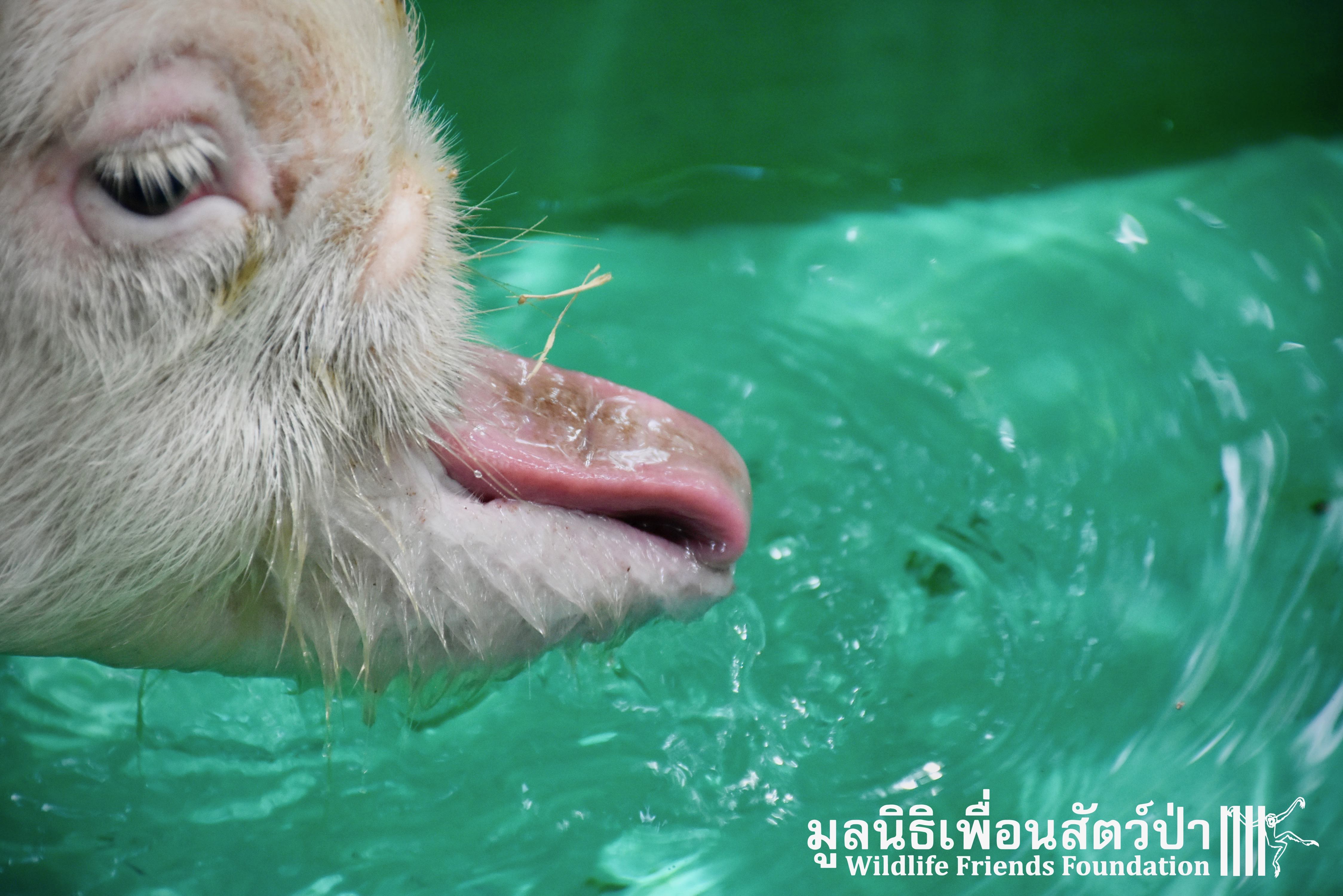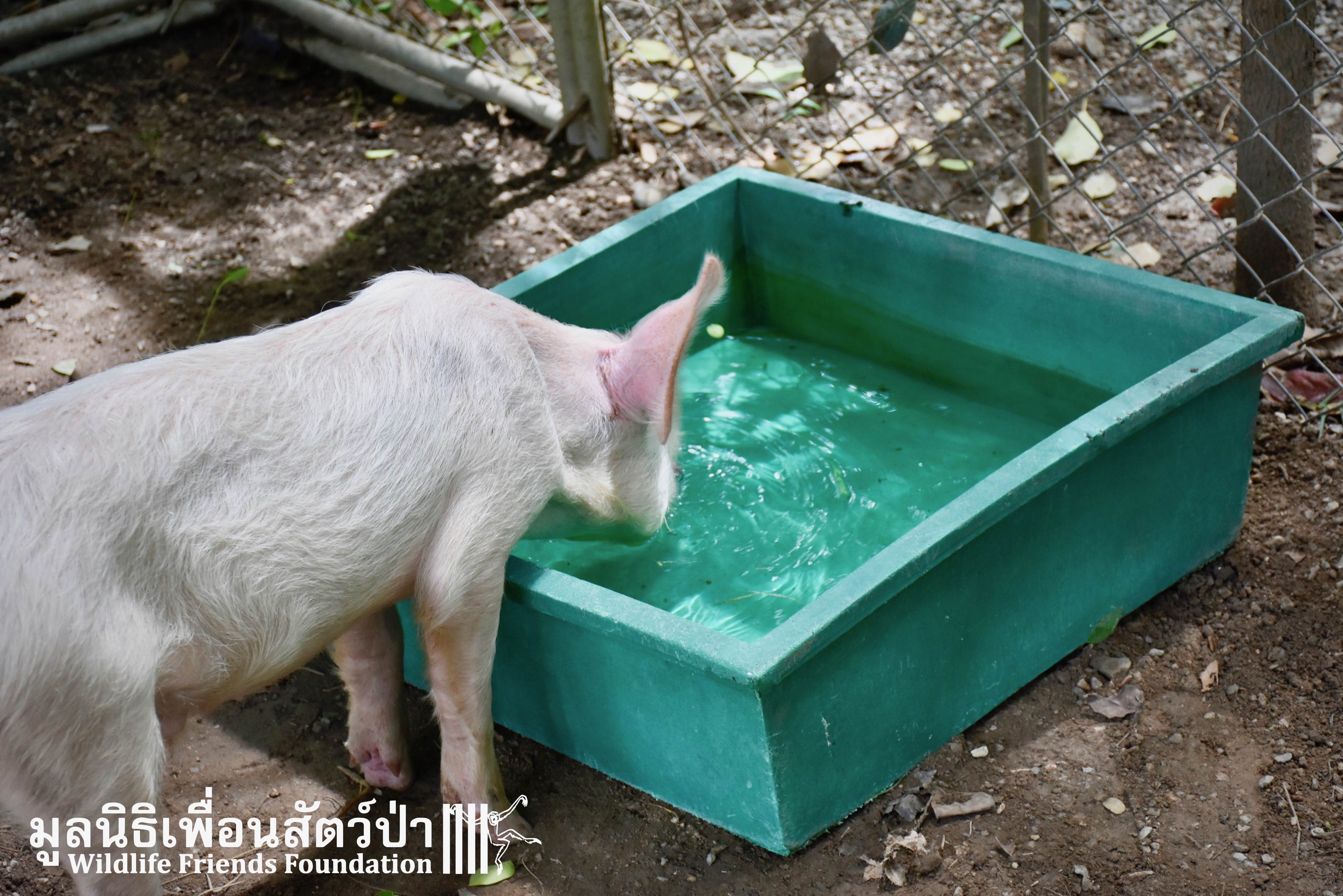 This young pig had been saved from drowning in a river by some concerned members of the public. They managed to save him and take him to the Phetchaburi Livestock Dept. office, who then called us for help. The vets at the Livestock Dept. knew that WFFT could provide this little guy with a new life. The WFFT Rescue Team went to collect this rather distinctive looking little guy. Upon arrival to WFFT Babe was given his own special quarantine pen, with a pool, a little shelter and ample amounts of freshly cut hay, which he absolutely loves to role around and sleep in. We estimate that Babe is around 3 months old.
