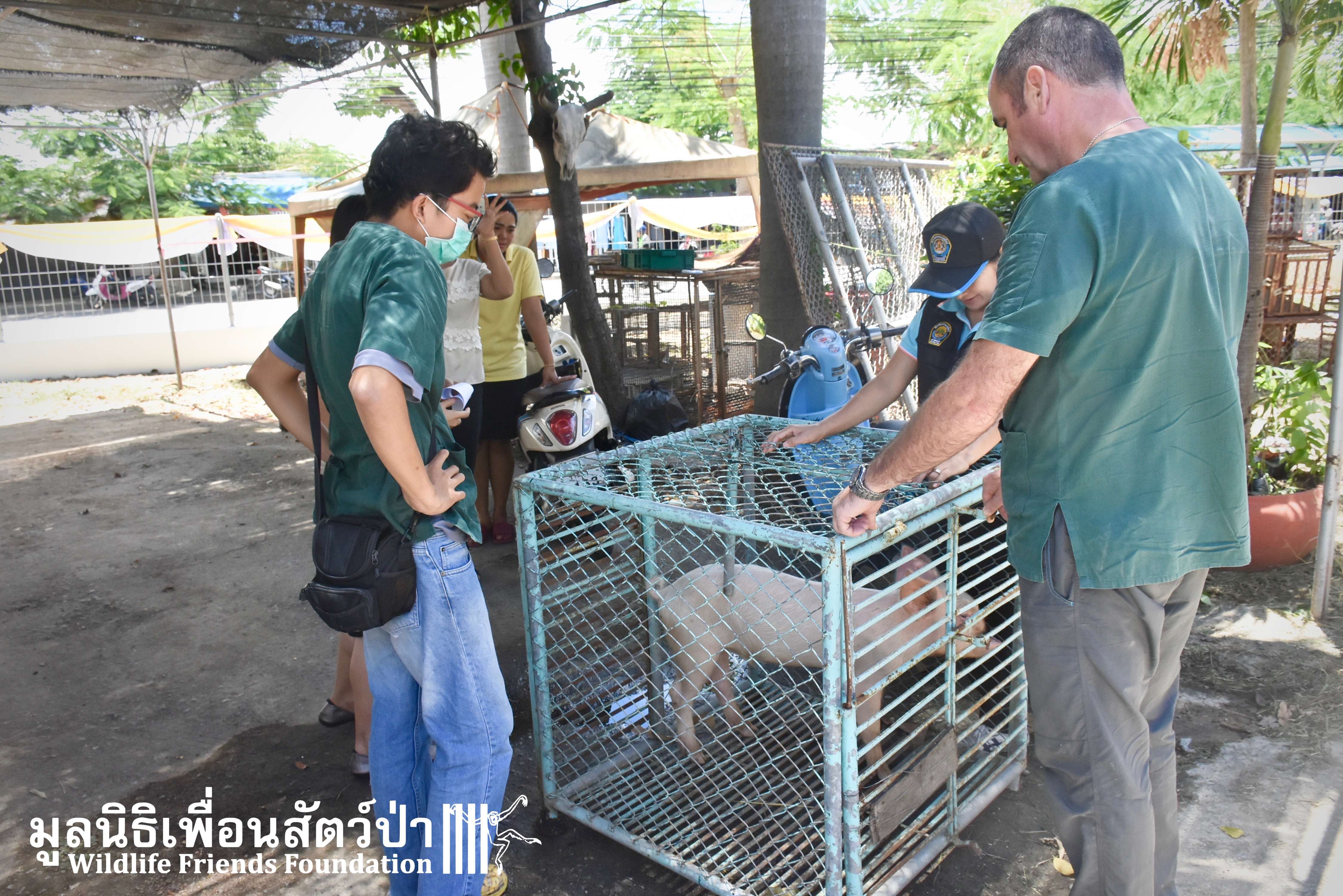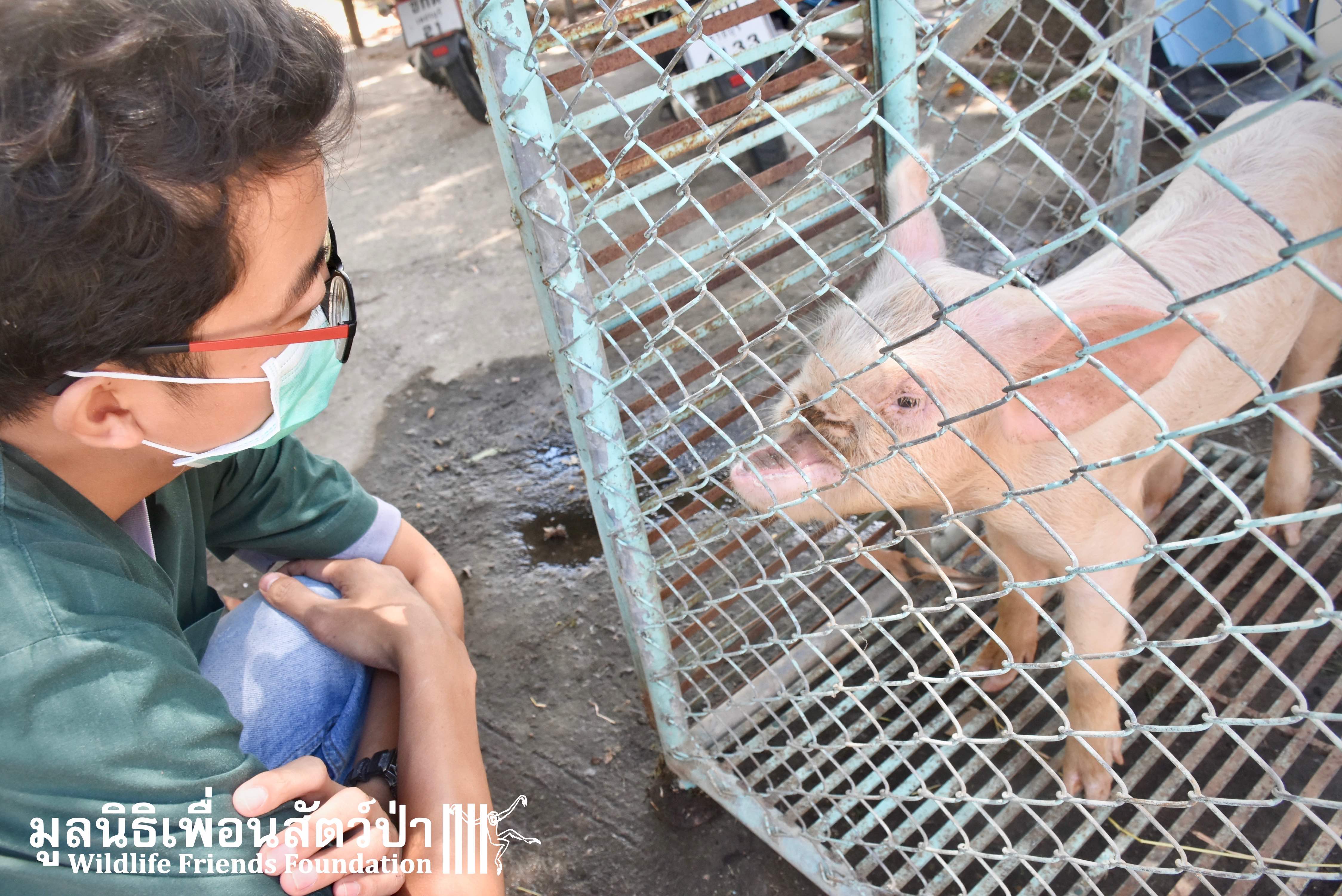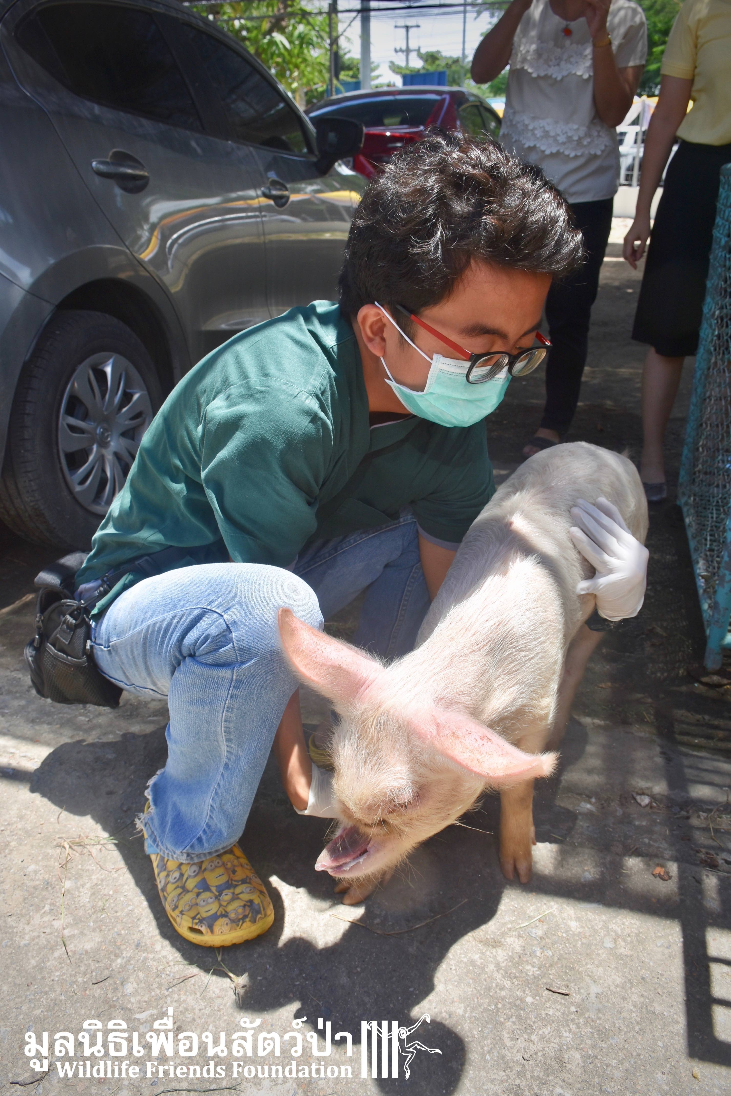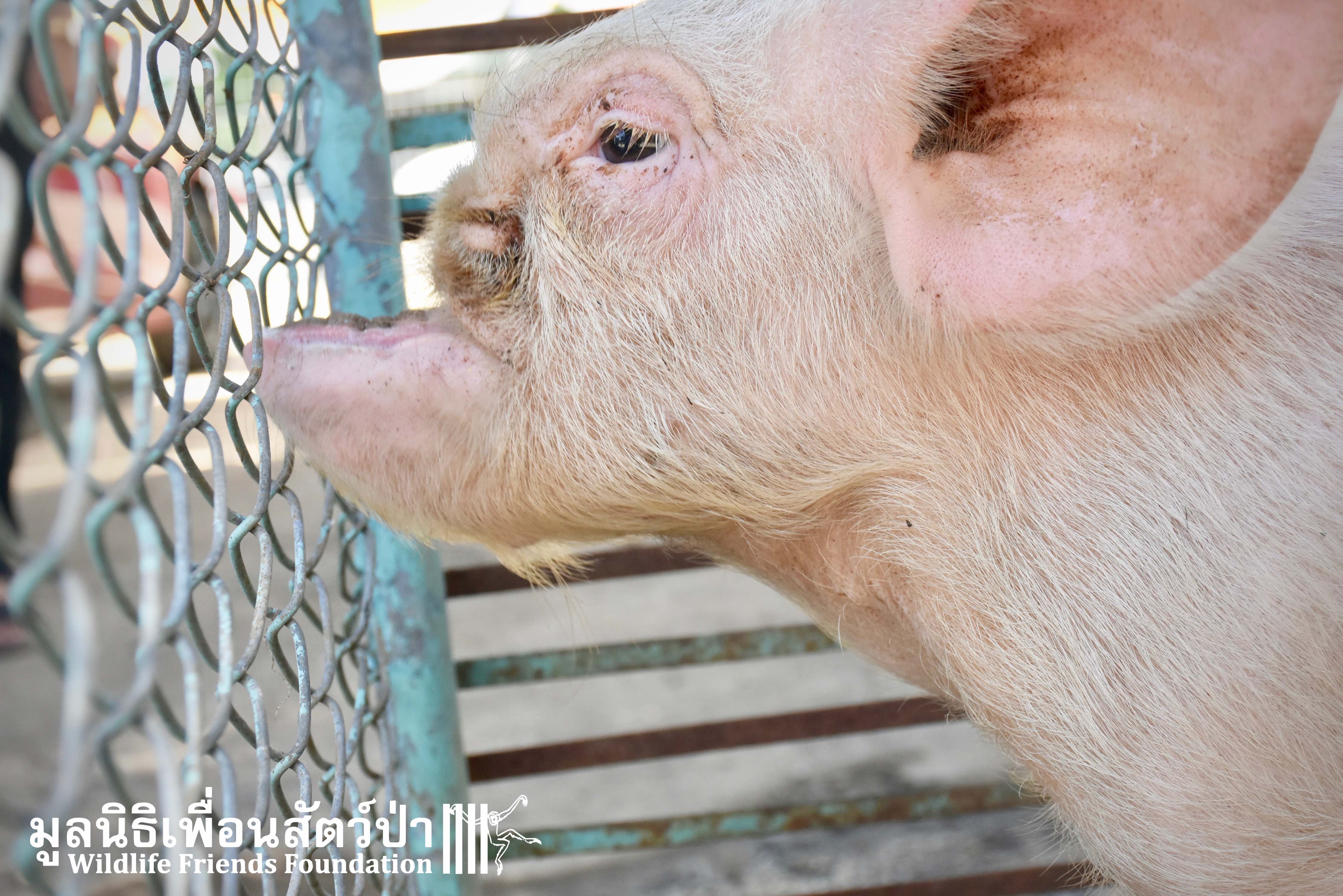 This young pig had been saved from drowning in a river by some concerned members of the public. They managed to save him and take him to the Phetchaburi Livestock Dept. office, who then called us for help. The vets at the Livestock Dept. knew that WFFT could provide this little guy with a new life. The WFFT Rescue Team went to collect this rather distinctive looking little guy. Upon arrival to WFFT Babe was given his own special quarantine pen, with a pool, a little shelter and ample amounts of freshly cut hay, which he absolutely loves to role around and sleep in. We estimate that Babe is around 3 months old.