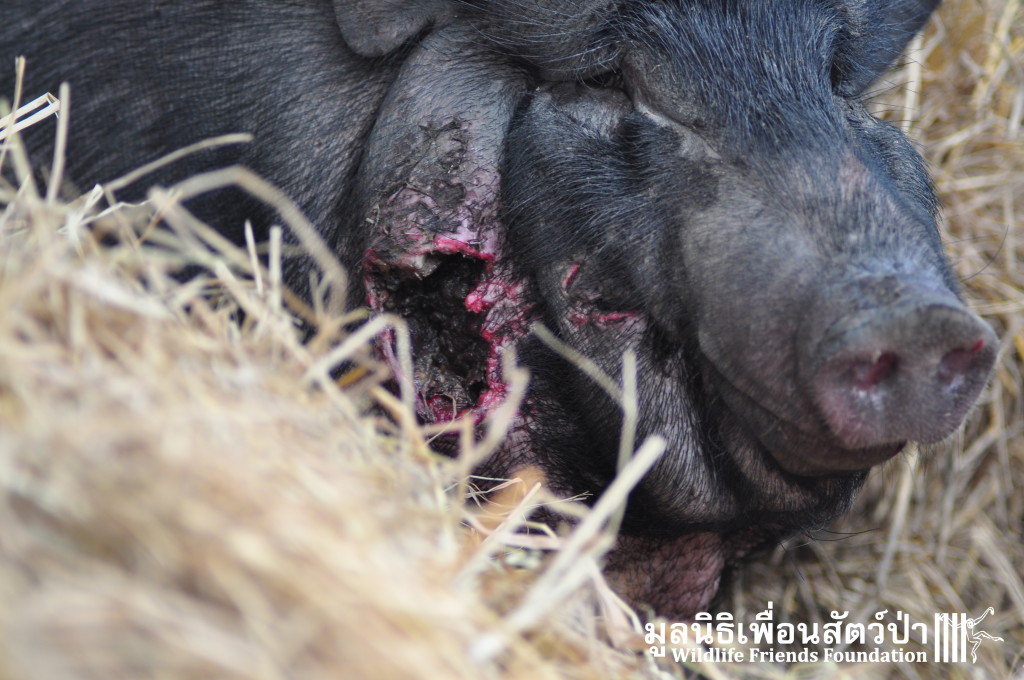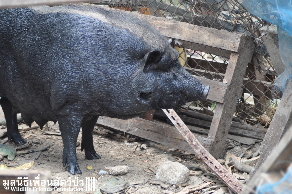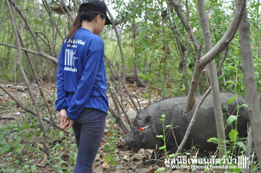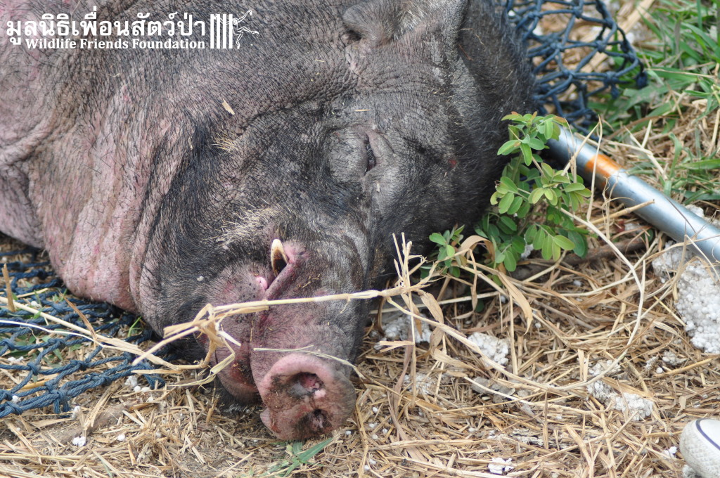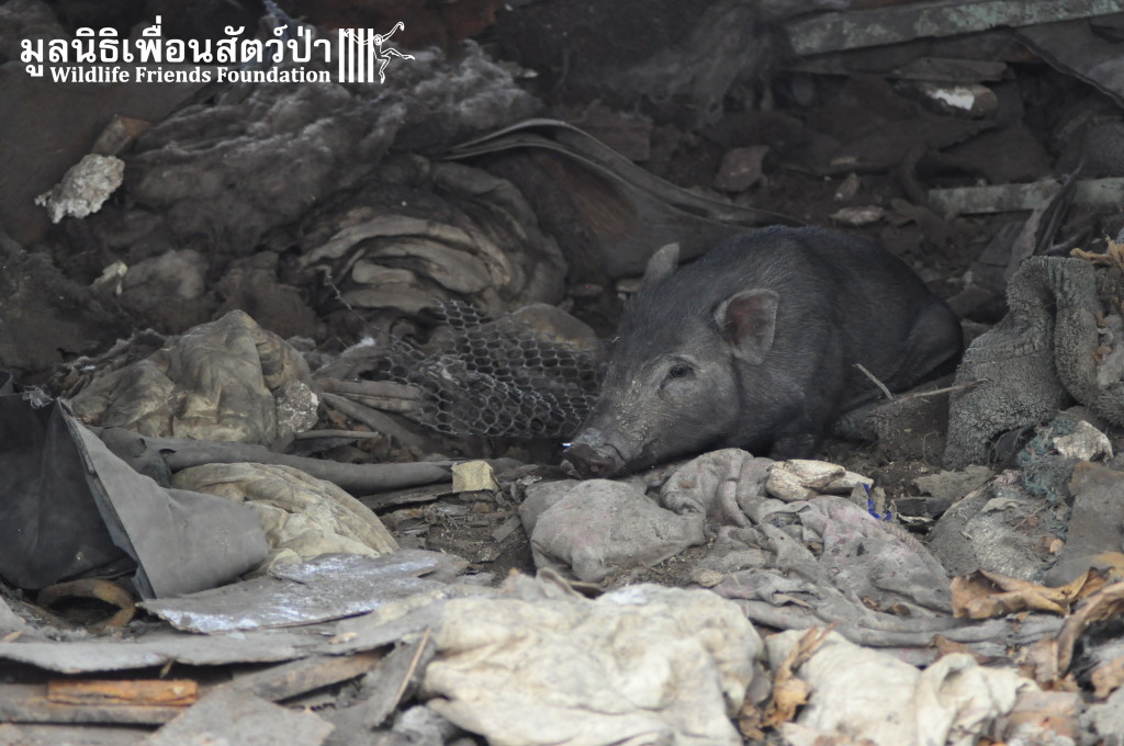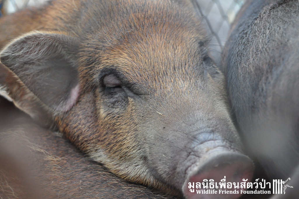Yesterday the WFFT Rescue Team headed north to Bangkok on a mission to rescue a group of 9 Eurasian wild pigs (Sus scrofa) that were marooned on a piece of waste land surrounded by heavily populated urban settlements. We were alerted to the plight of these poor animals by TV personality Kittipong Khamsat from หมากาพย์ หมาจร and a long-term supporter of WFFT, Tossaporn Klunkaew. They had all originated from two individuals that had been released into an enclosed grassland area some years ago. As the years went by these pigs were under more and more pressure from urban expansion and poaching by hunters for food. This family off pigs had been at the site for many years without appropriate food or access to clean drinking water. Over the years they have managed to survive by being fed household food waste from kindhearted locals. Upon arrival to the site the WFFT Rescue Team were shocked at some of the clearly visible human caused injuries sustained by many of the pigs, barbaric barbed arrows had been used in an attempt to capture these pigs and eat them. A team of over 15 people spent the whole day rounding up the pigs to bring them back to the WFFT Wildlife Rescue Centre for urgent veterinary treatment and to provide them with a suitable home.