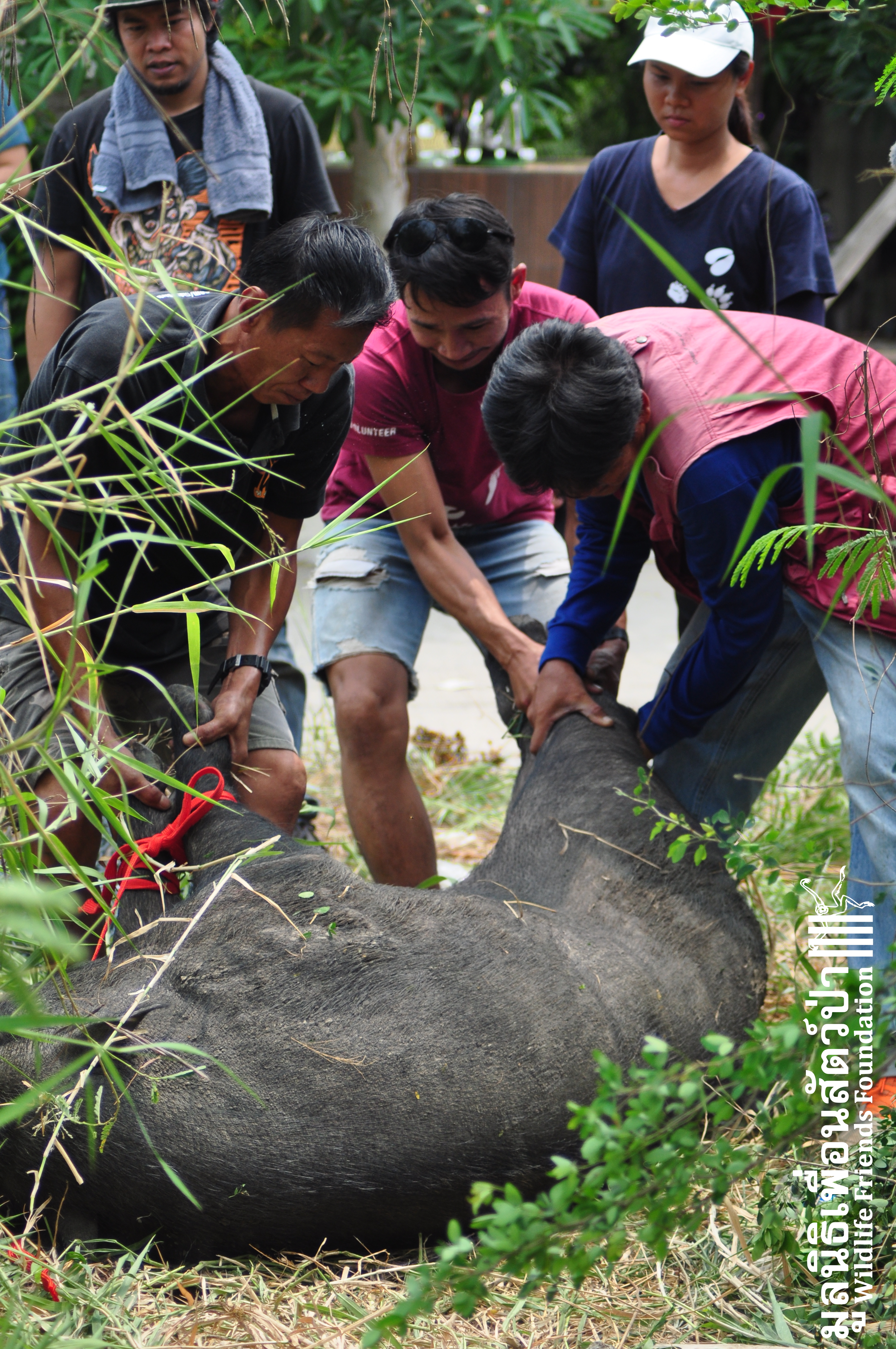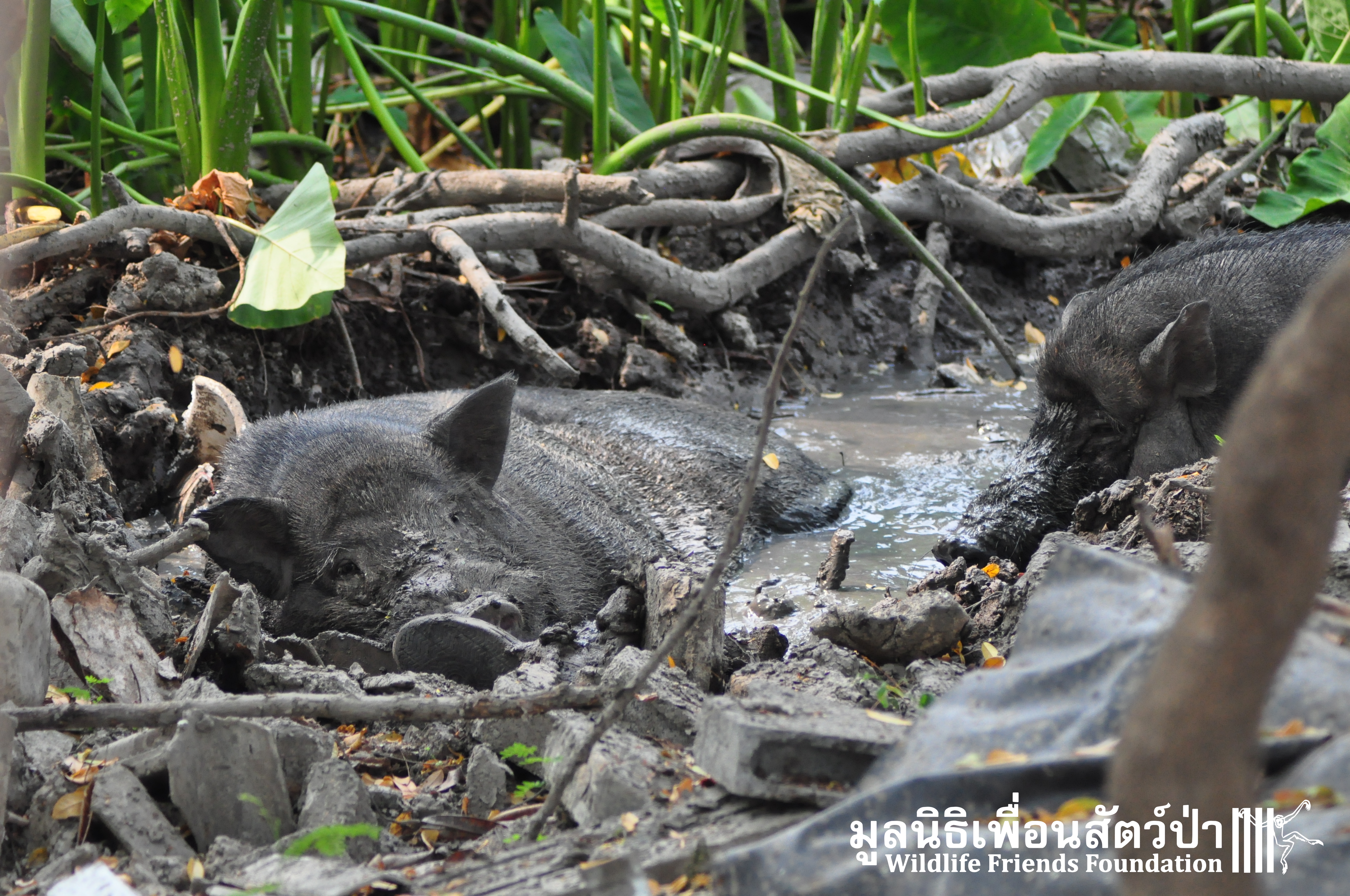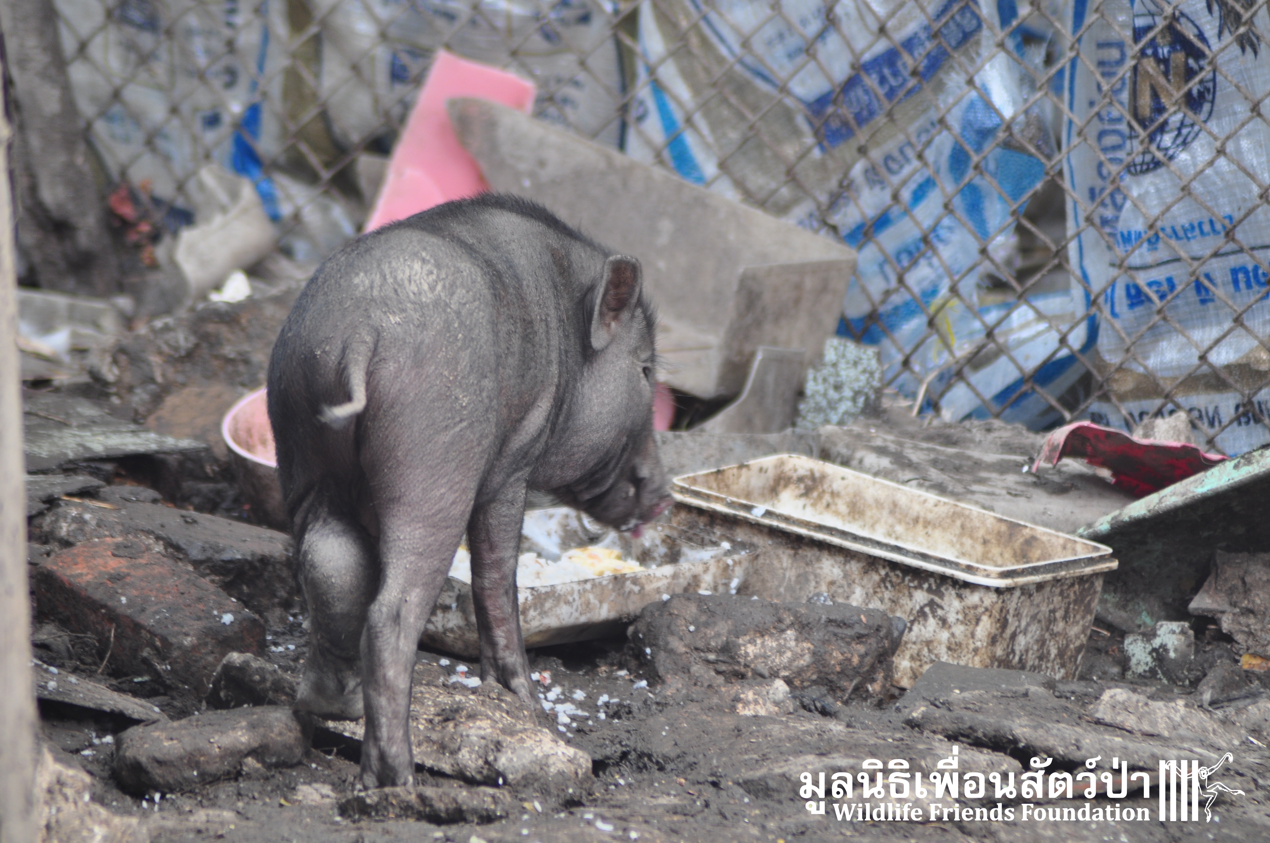 Yesterday the WFFT Rescue Team headed north to Bangkok on a mission to rescue a group of 9 Eurasian wild pigs (Sus scrofa) that were marooned on a piece of waste land surrounded by heavily populated urban settlements. We were alerted to the plight of these poor animals by TV personality Kittipong Khamsat from หมากาพย์ หมาจร and a long-term supporter of WFFT, Tossaporn Klunkaew. They had all originated from two individuals that had been released into an enclosed grassland area some years ago. As the years went by these pigs were under more and more pressure from urban expansion and poaching by hunters for food. This family off pigs had been at the site for many years without appropriate food or access to clean drinking water. Over the years they have managed to survive by being fed household food waste from kindhearted locals. Upon arrival to the site the WFFT Rescue Team were shocked at some of the clearly visible human caused injuries sustained by many of the pigs, barbaric barbed arrows had been used in an attempt to capture these pigs and eat them. A team of over 15 people spent the whole day rounding up the pigs to bring them back to the WFFT Wildlife Rescue Centre for urgent veterinary treatment and to provide them with a suitable home.