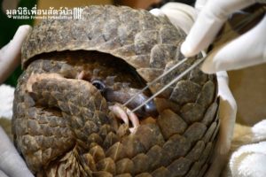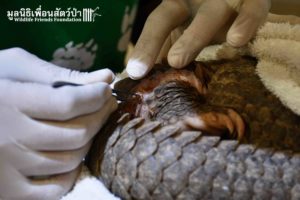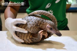After a few hours in our care the pangolin regained its strength quickly and on x-rays and blood check no problems were found. We think the pangolin either got lost from its original habitat into a village area, or might have escaped from illegal traders.