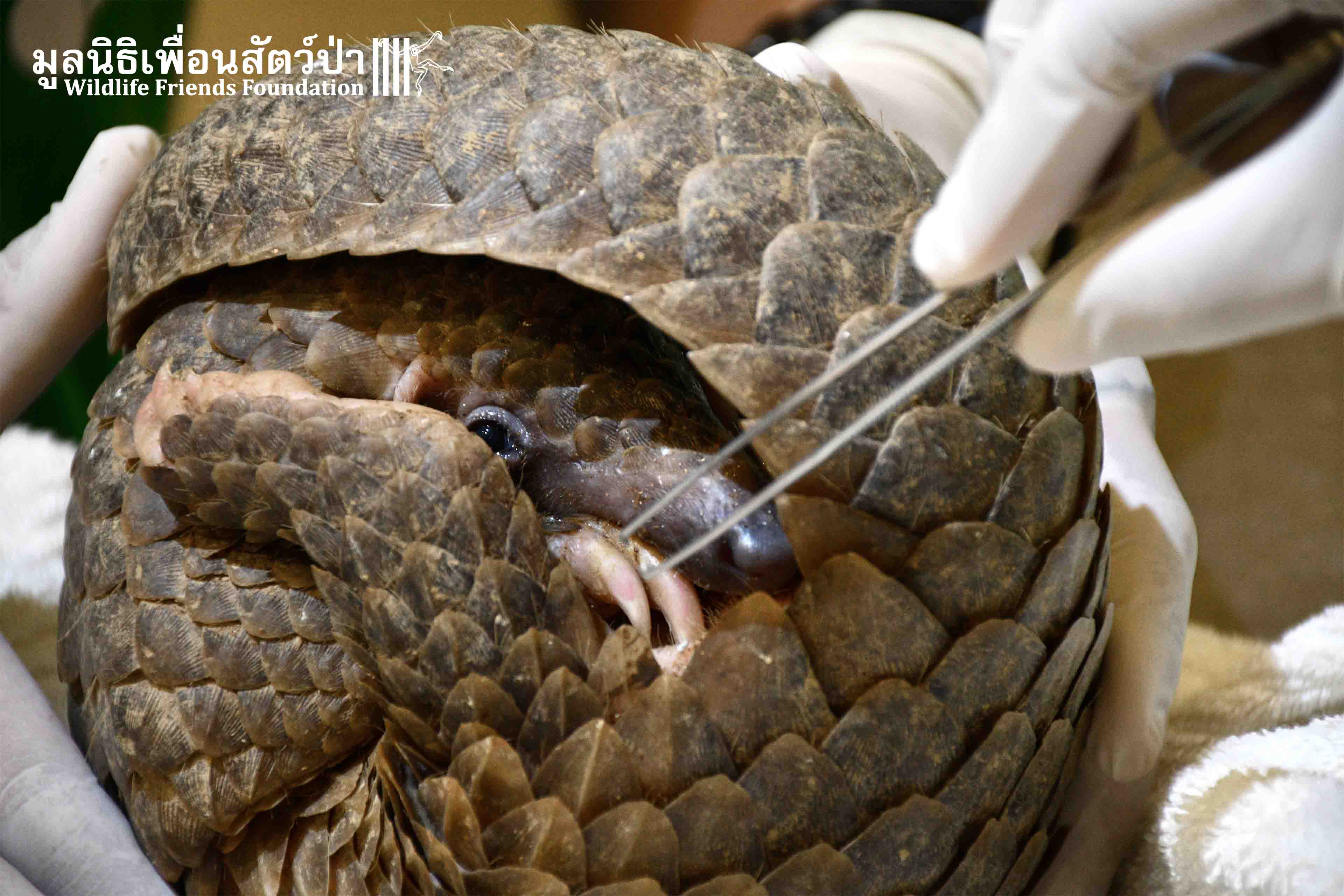 เมื่อไปถึงเราได้ทำความสะอาดเอามดออกจากตัวเป็นอย่างเเรกเเละป้อนน้ำเพื่อเพิ่มความเเข็งเเรง จากนั้นจึงนำกลับมาที่โรงพยาบาลสัตว์ป่าเพื่อตรวจร่างกายอย่างเต็มรูปแบบและวางแผนที่จะฟื้นฟู