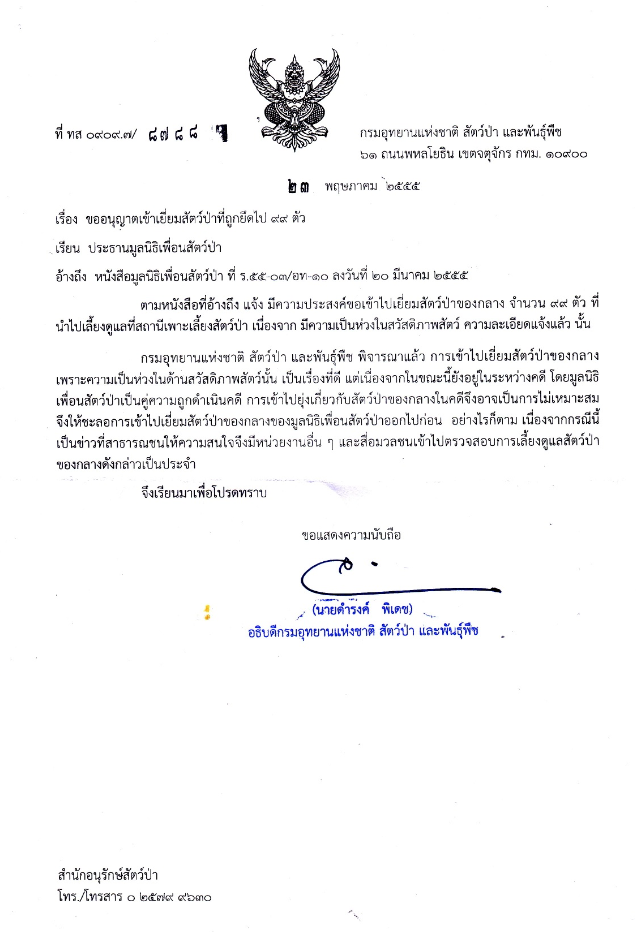 A few days ago we finally received an official reply to our demand to see the confiscated animals that were forcibly taken in February of this year. During the raid we asked repeatedly if we were allowed to visit the confiscated animals and check on their wellbeing (on the video clip hereunder you can hear the director-general say repeatedly that we can of course go see them) and we did believe him at that time, however when we asked to go see the animals at Kao Zon and Kao Prathap Chang wildlife breeding centers we were refused entry, there was even a sign on the front gate with Edwin’s picture on it and the text “This person is not allowed to enter at any circumstance!” (See picture under the article)
