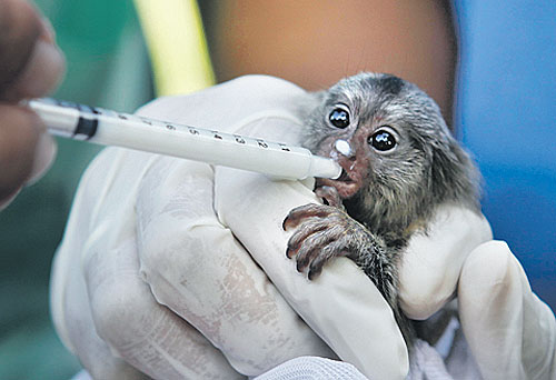 Marmoset being fed milk at Bangkok Airport after being found hidden in a suitcase